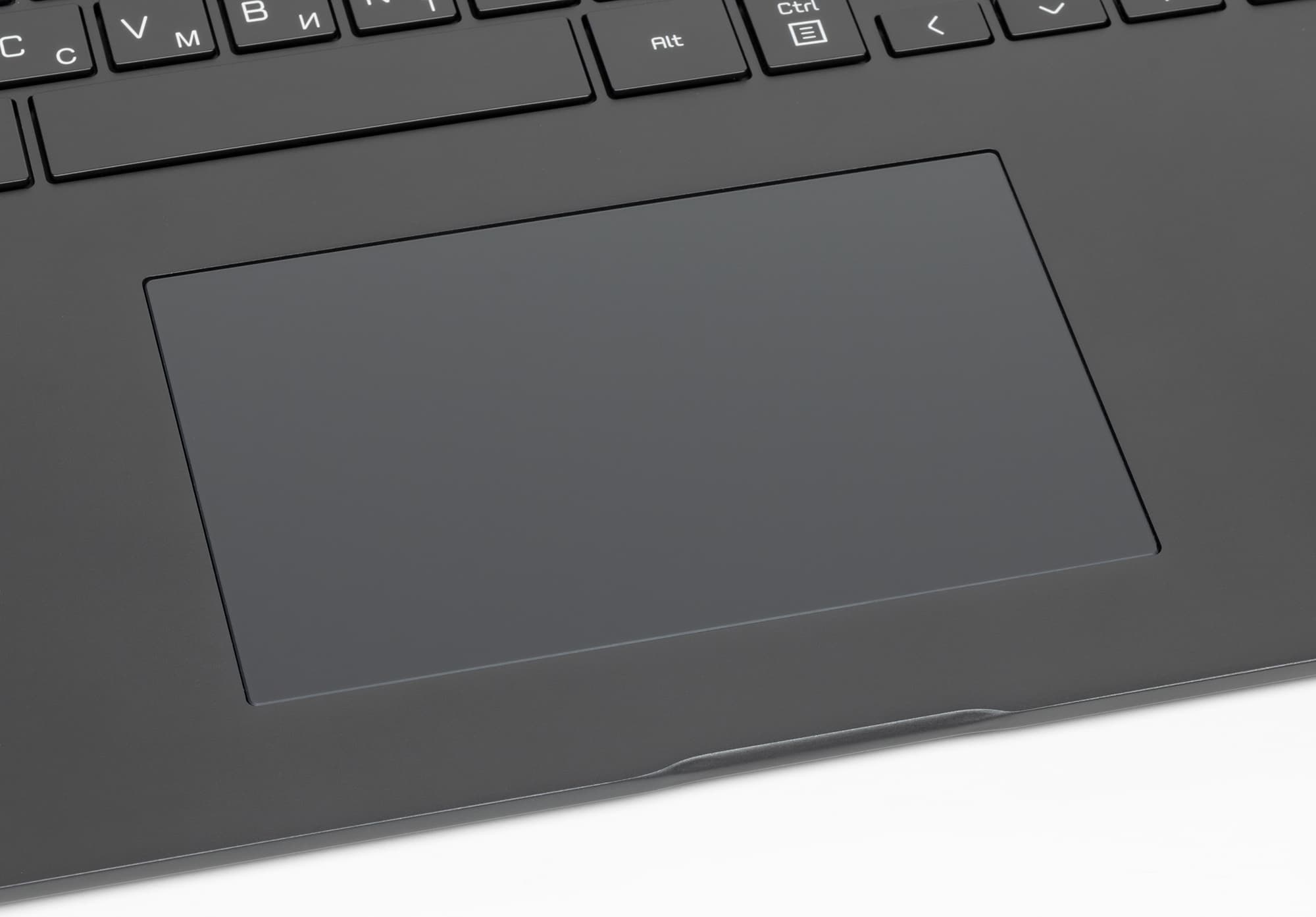 Перед клавиатурой расположен чуть утопленный и заметно увеличенный (132×83 мм) по сравнению с типичными 17-дюймовыми моделями кликпад без выделенных кнопок. Дальняя часть сенсорной площадки на нажатия реагирует плохо, лучше делать это в ближнем к пользователю поле, где четкость срабатывания очень хорошая. С жестами, подразумевающими только касание поверхности, никаких проблем нет.