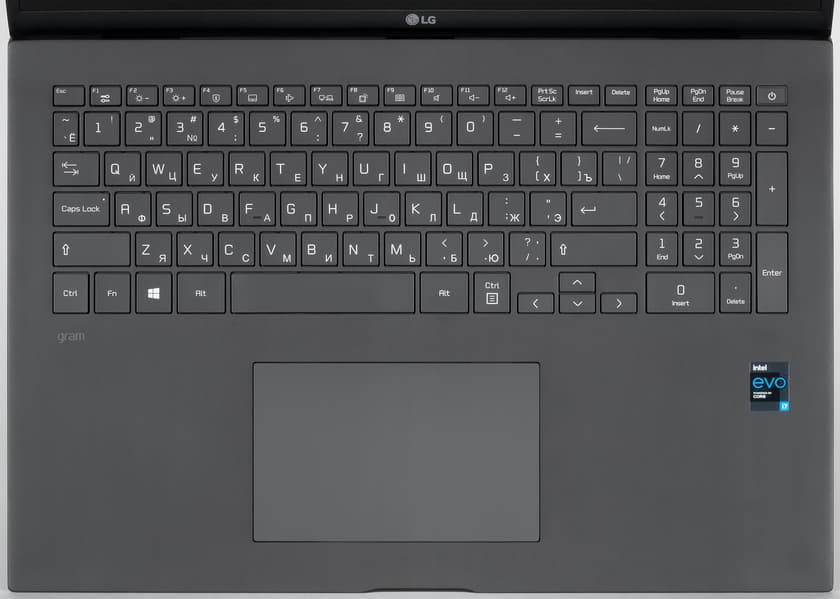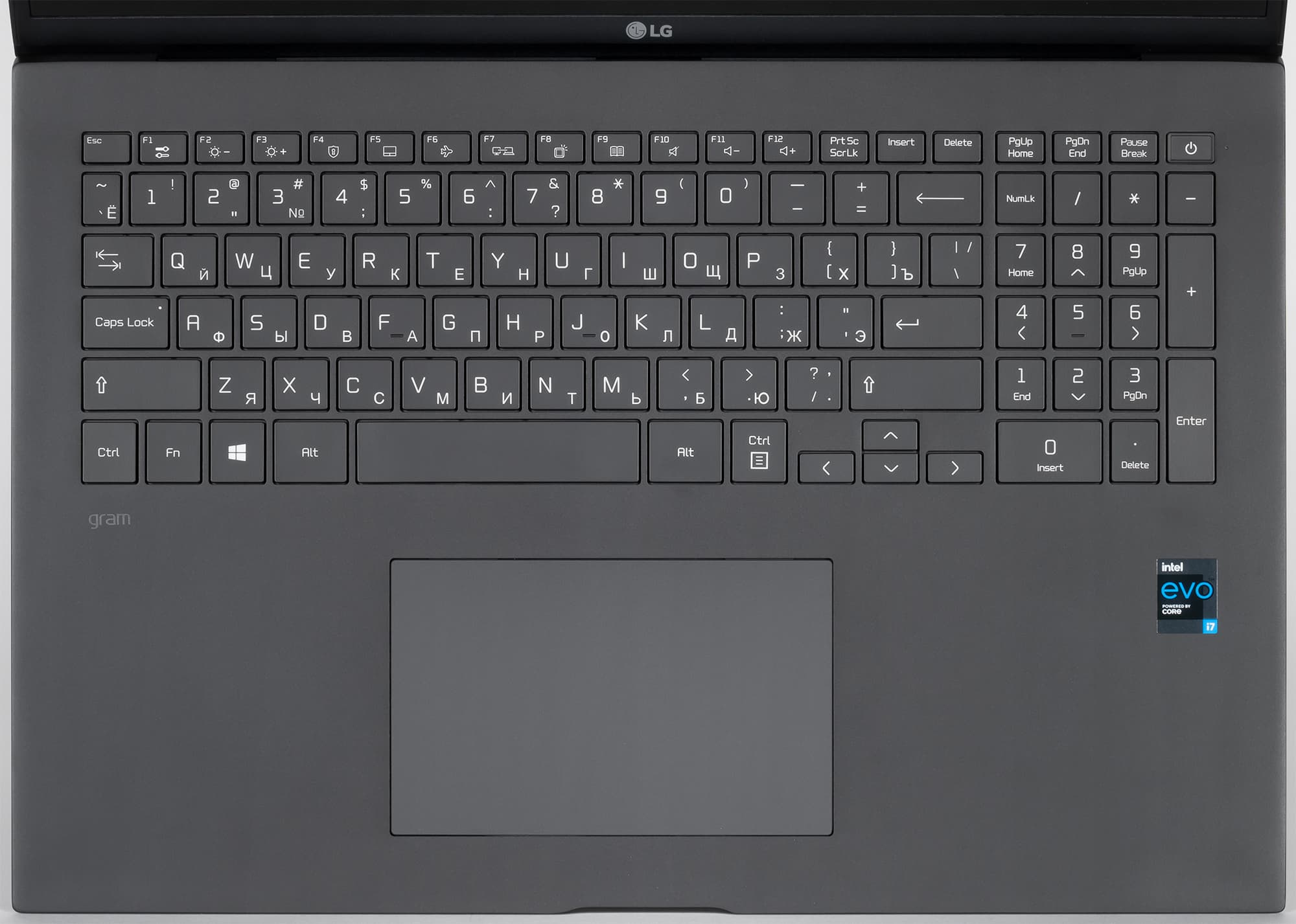 В LG gram 17Z90P используется полноразмерная клавиатура мембранного типа с цифровым блоком и с традиционно небольшим вертикальным ходом кнопок (около 1,5 мм). По топографии зон, раскладке и функциональности она примерно соответствует десктопной за вычетом шестиклавишного навигационного блока: Insert, Delete. Home, End, Page Up, Page Down расположены в верхнем ряду после функциональных клавиш, последние 4 попарно совмещены. Стрелки вдвое уменьшены по высоте, из-за чего пользоваться ими труднее. Алфавитно-цифровые клавиши чуть крупнее стандартных ноутбучных (15×16 мм). Расстояние между их центрами составляет 19 мм, а между краями — 4 мм. Ширина правого Shift — 38 мм, левого — 35 мм, пробела — 85 мм. Функциональные кнопки уменьшены до 13×9 мм.