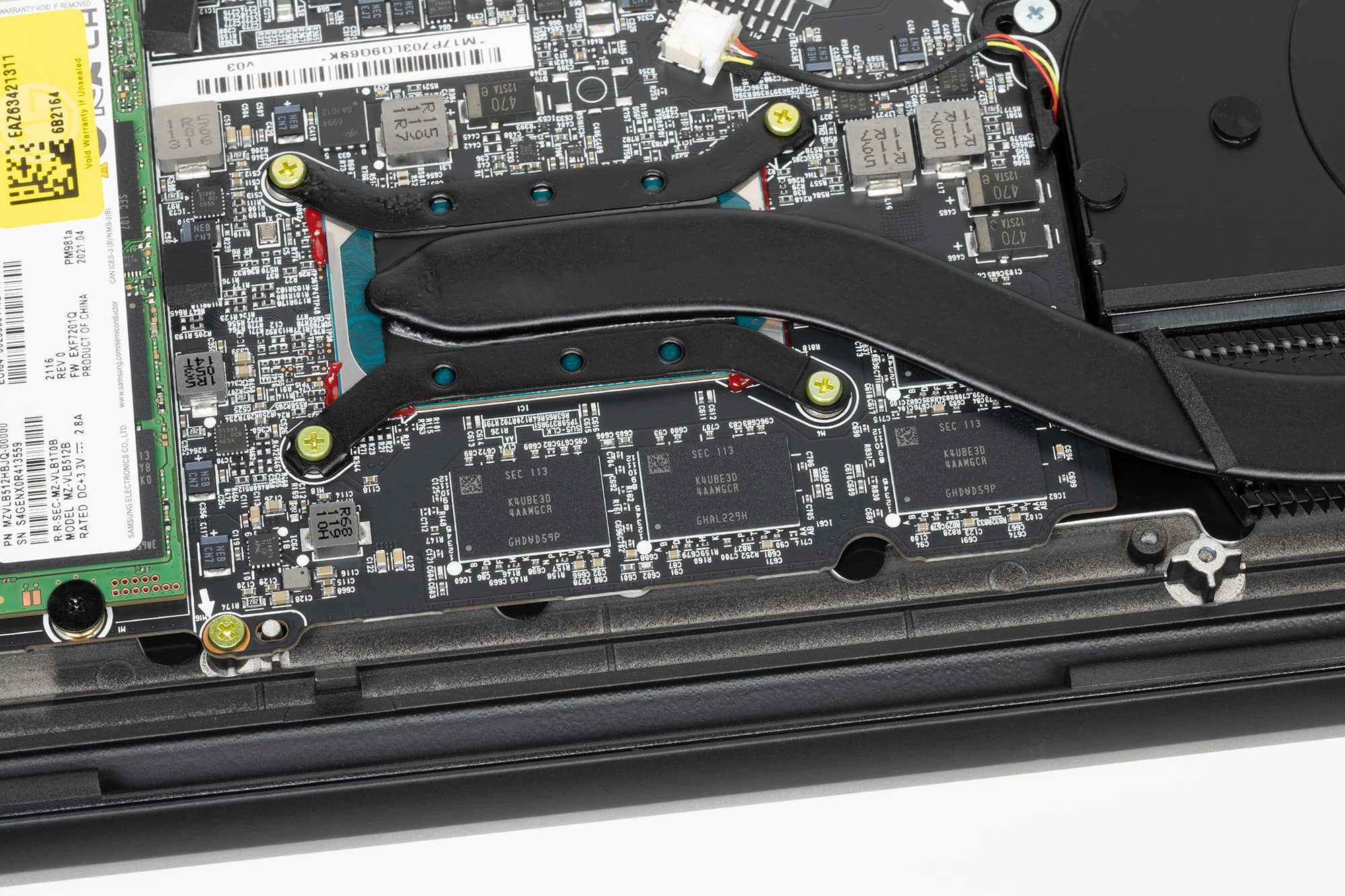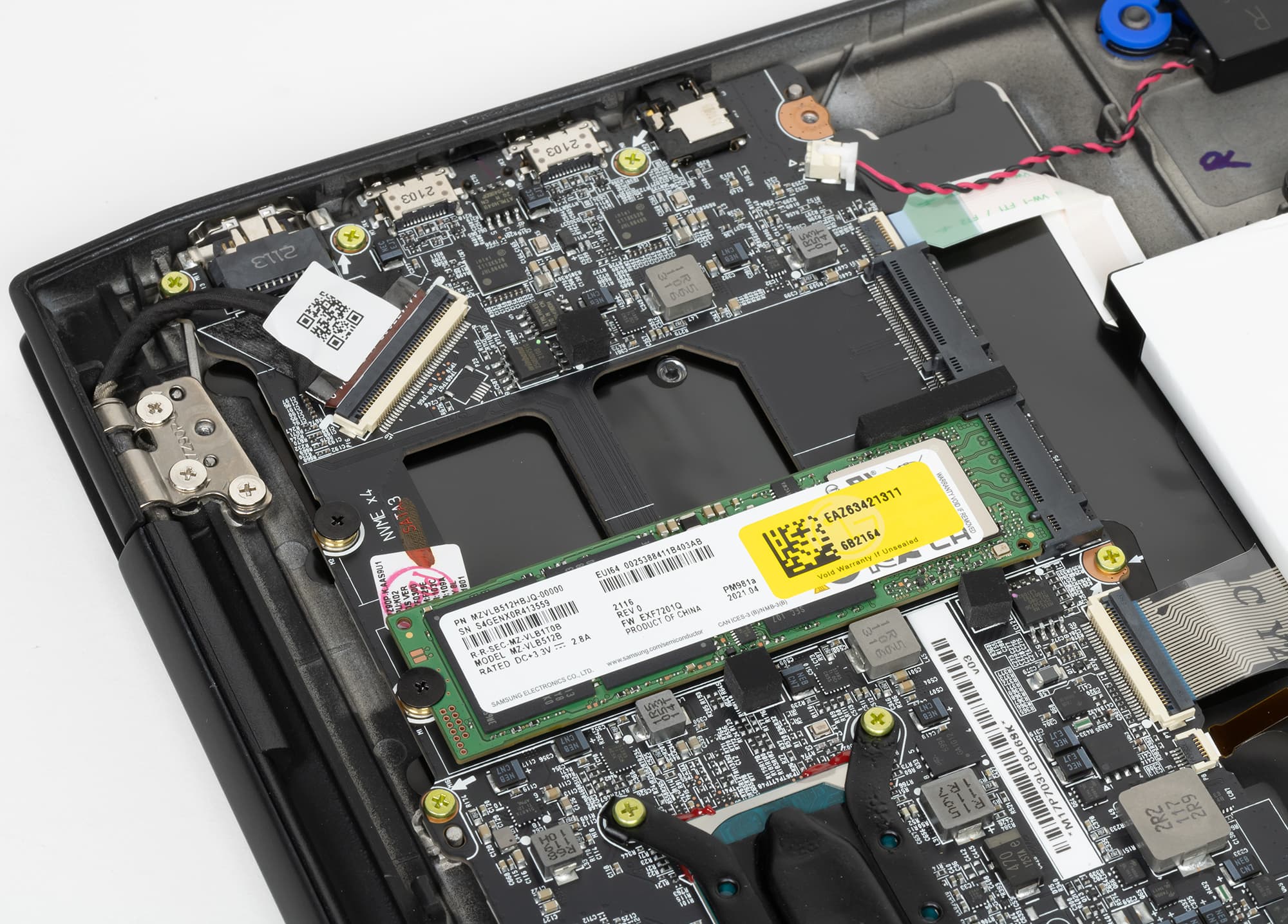 Система охлаждения редуцирована до минимума по набору компонентов, их форме, весу и размерам: один вентилятор, одна тепловая трубка, один радиатор. В отличие от типичного для других устройств конструктива, в котором место контакта тепловой трубки с диссипаторами процессора и графики скрыто от глаз, здесь производитель сэкономил на маскировке (и это правильно). Поэтому видна вожделенная сине-зеленая подложка Intel Core i7-1165G7. Под установленным SSD и над вторым (пустующим) слотом M.2 в системной плате сделано два выреза. Из косо расположенного гребенчатого разъема в канал левой (на фото — правой) петли крышки уходит сигнальный и питающий кабель экрана.