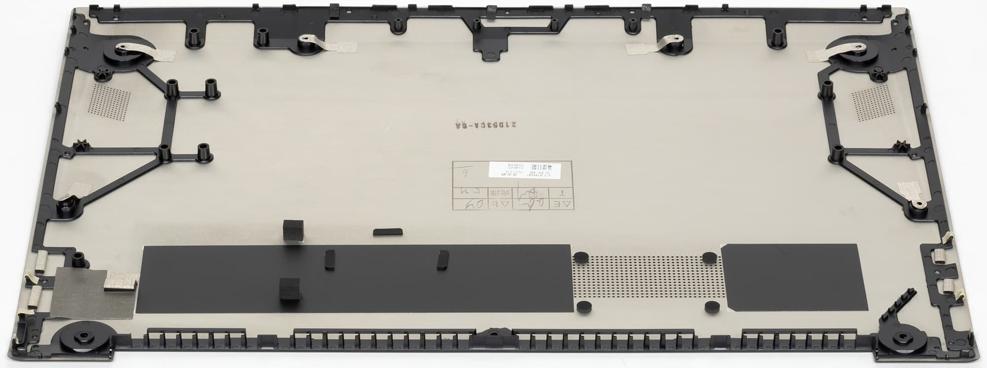 На нижней панели мало примечательного: четыре толстых резиновых опоры, линейка вентиляционных отверстий да решетки над динамиками у скосов корпуса ближе к переднему краю. Вероятно, из эстетических соображений производитель прячет крепежные винты под резиновыми опорами и круглыми наклейками, поэтому при разборке корпуса придется каждый раз отрывать этот камуфляж, а затем приклеивать его обратно.
