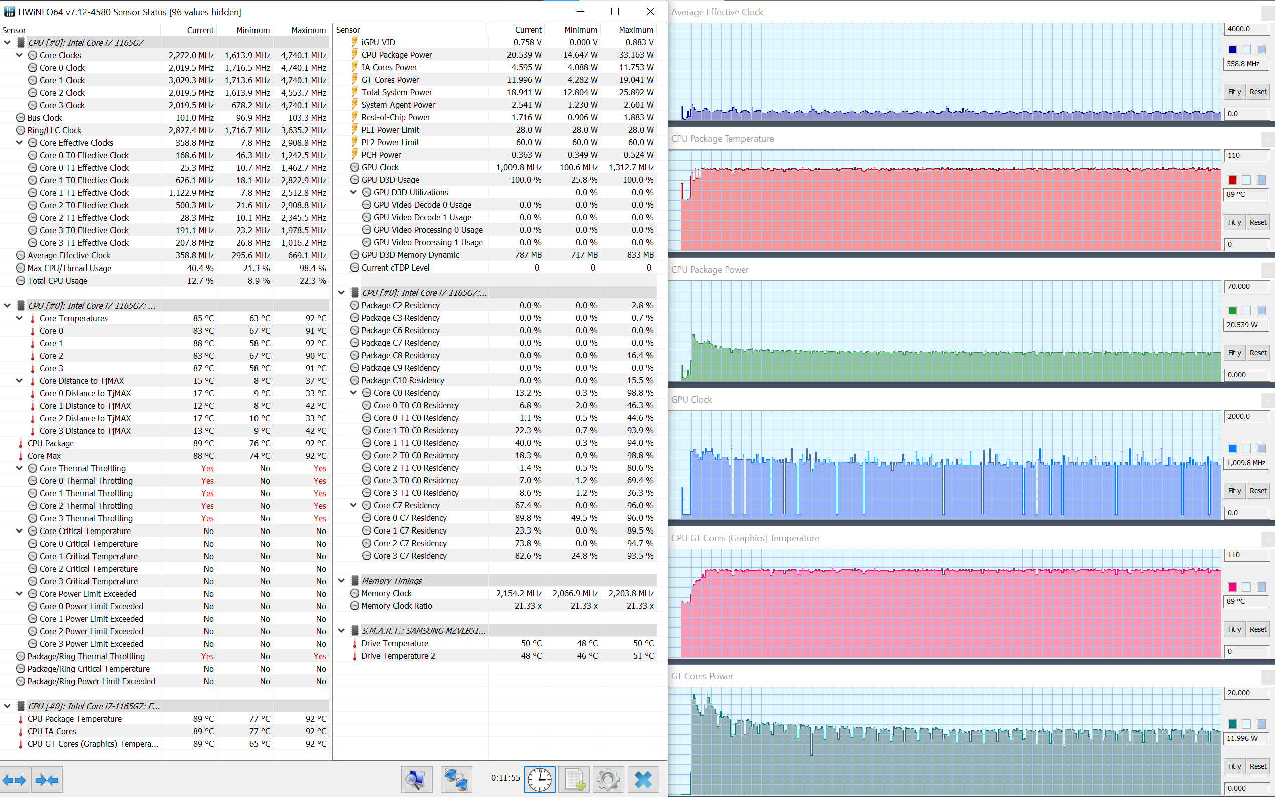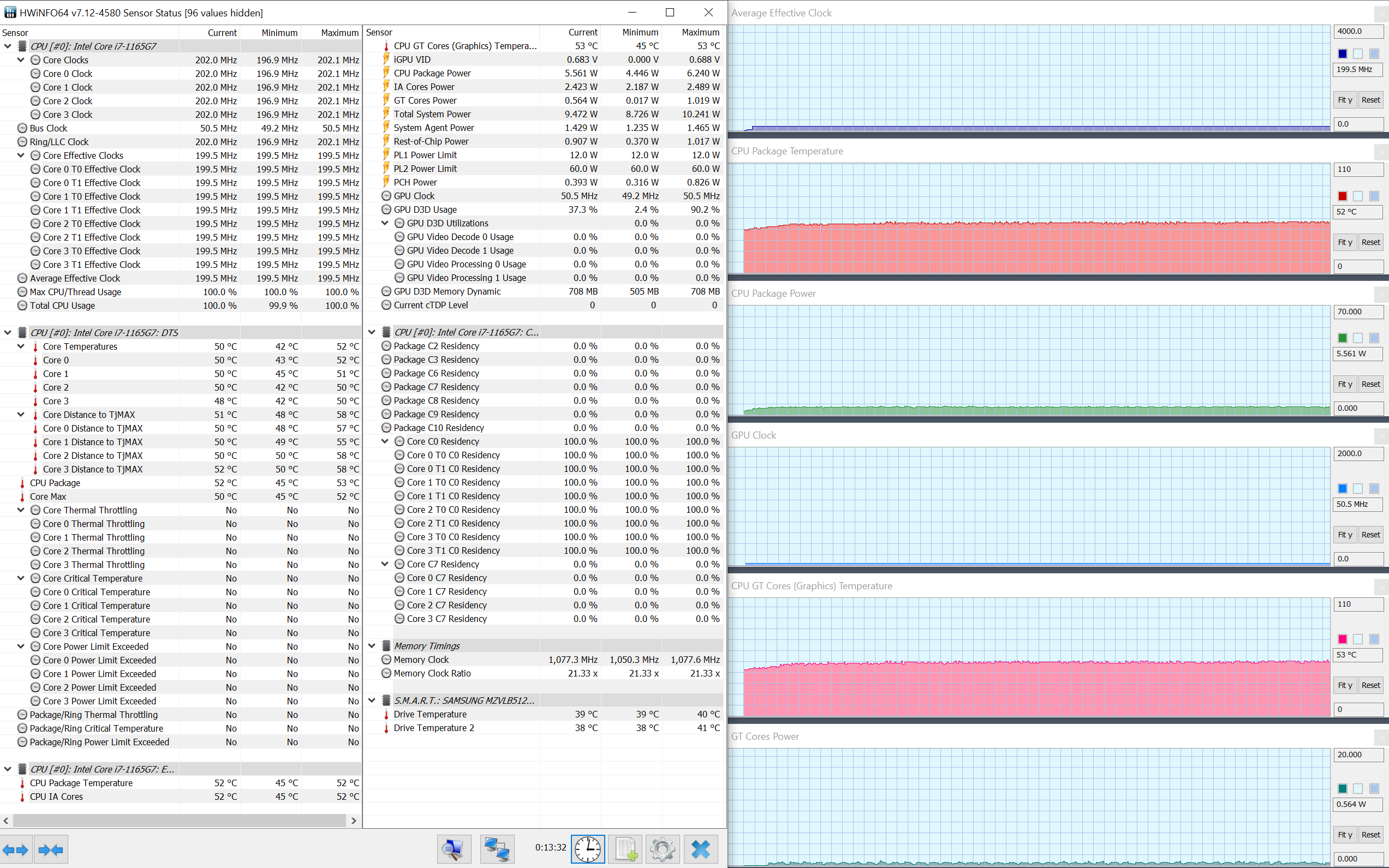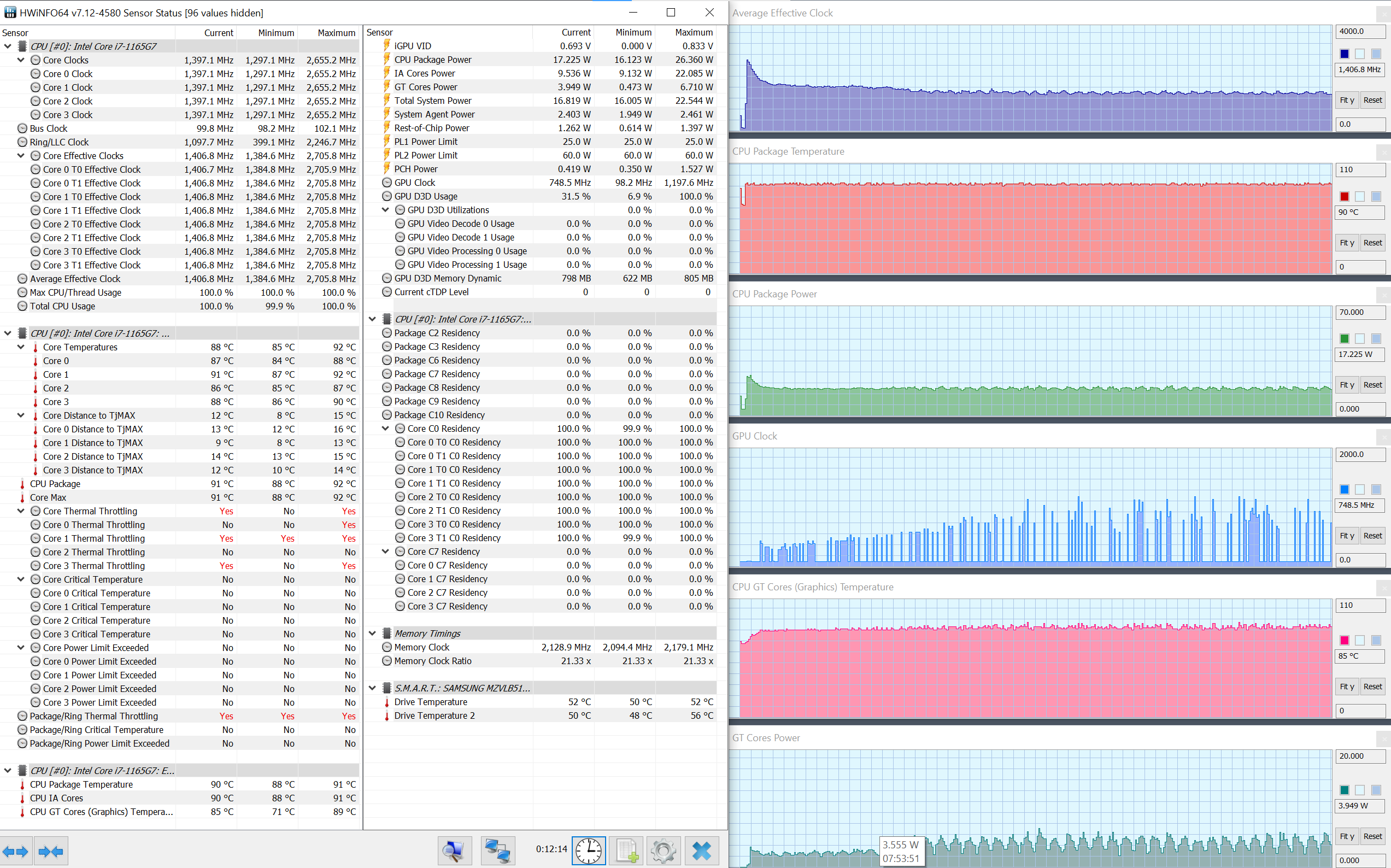 Под максимальной нагрузкой GPU ведет себя предсказуемо, но в первые 20 с «показывает характер»: отмечаются три волны подъема тактовой частоты до 1300 МГц (при этом потребление возрастает до 20 Вт) и последующих снижений на 15%-20%. После третьей волны тактовая частота на 2 секунды сбрасывается до минимального значения (100 МГц), и видеоускоритель начинает вести себя спокойнее. Хотя его попытки разогнаться продолжаются, подъемы тактовой частоты длятся лишь по 1—3 с и перемежаются резкими кратковременными спадами до упомянутого минимума 100 МГц. Потребление продолжает формировать на графике подъемы амплитудой 1—1,5 Вт и длительностью около 6 с (картина напоминает зубчатую стену средневековой крепости), но постепенно съезжает к среднему значению 10 Вт, которое устанавливается примерно к середине 4-й минуты. Температура GPU за первые 10 с тестового прогона достигает 92 °C (это очень много) и далее колеблется в пределах 3 °C. Утилита HWInfo не фиксирует перегрева, но сигнализирует о тротлинге у всех ядер CPU.