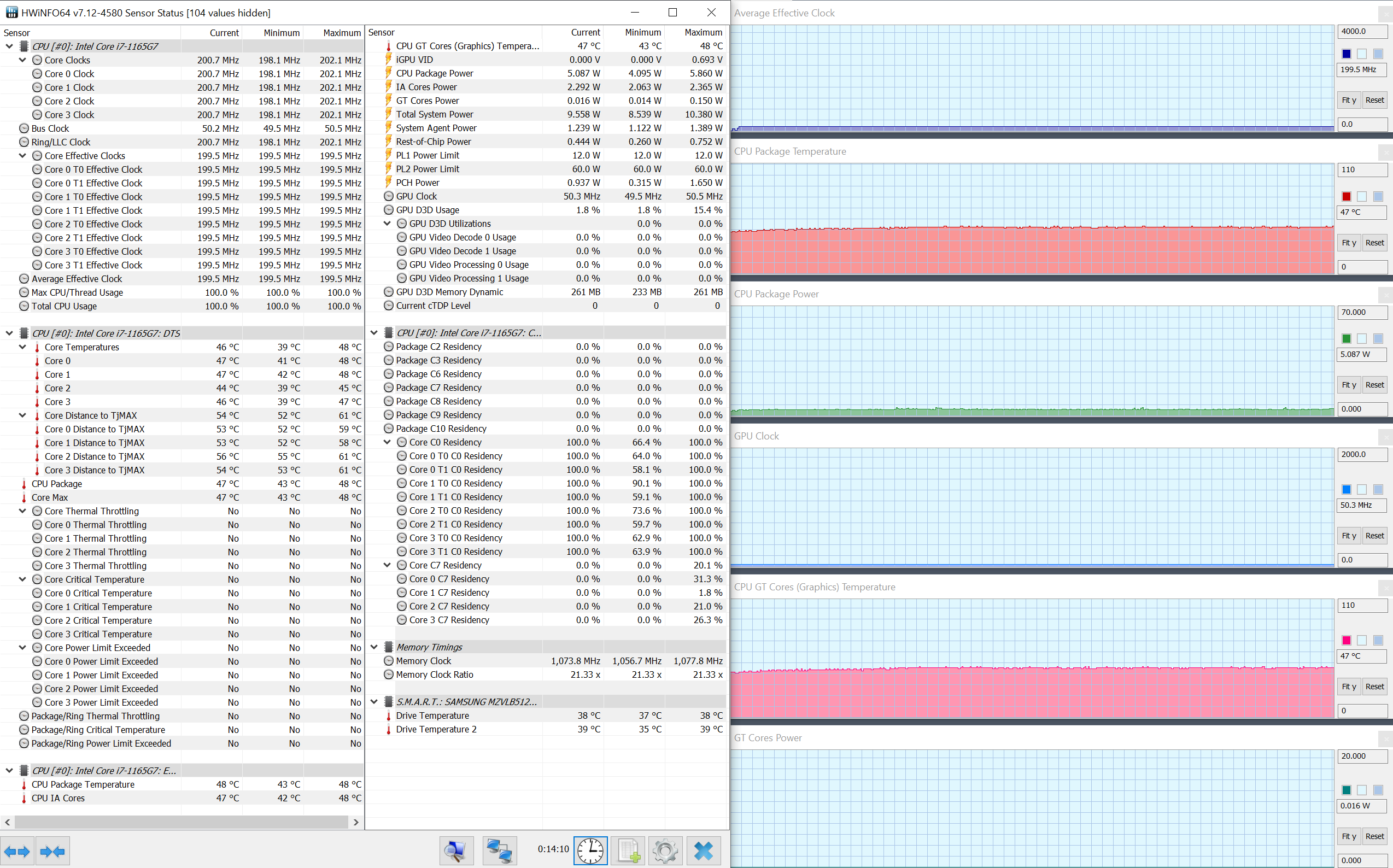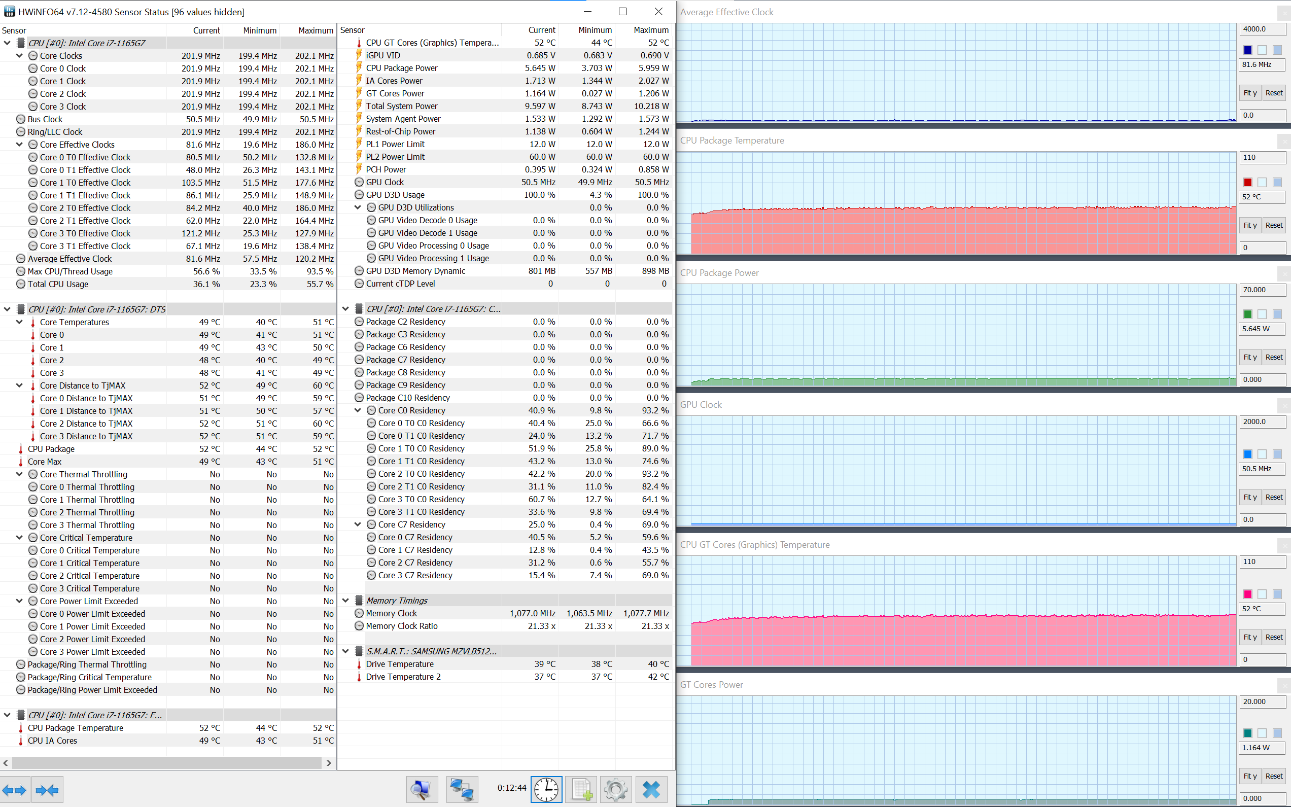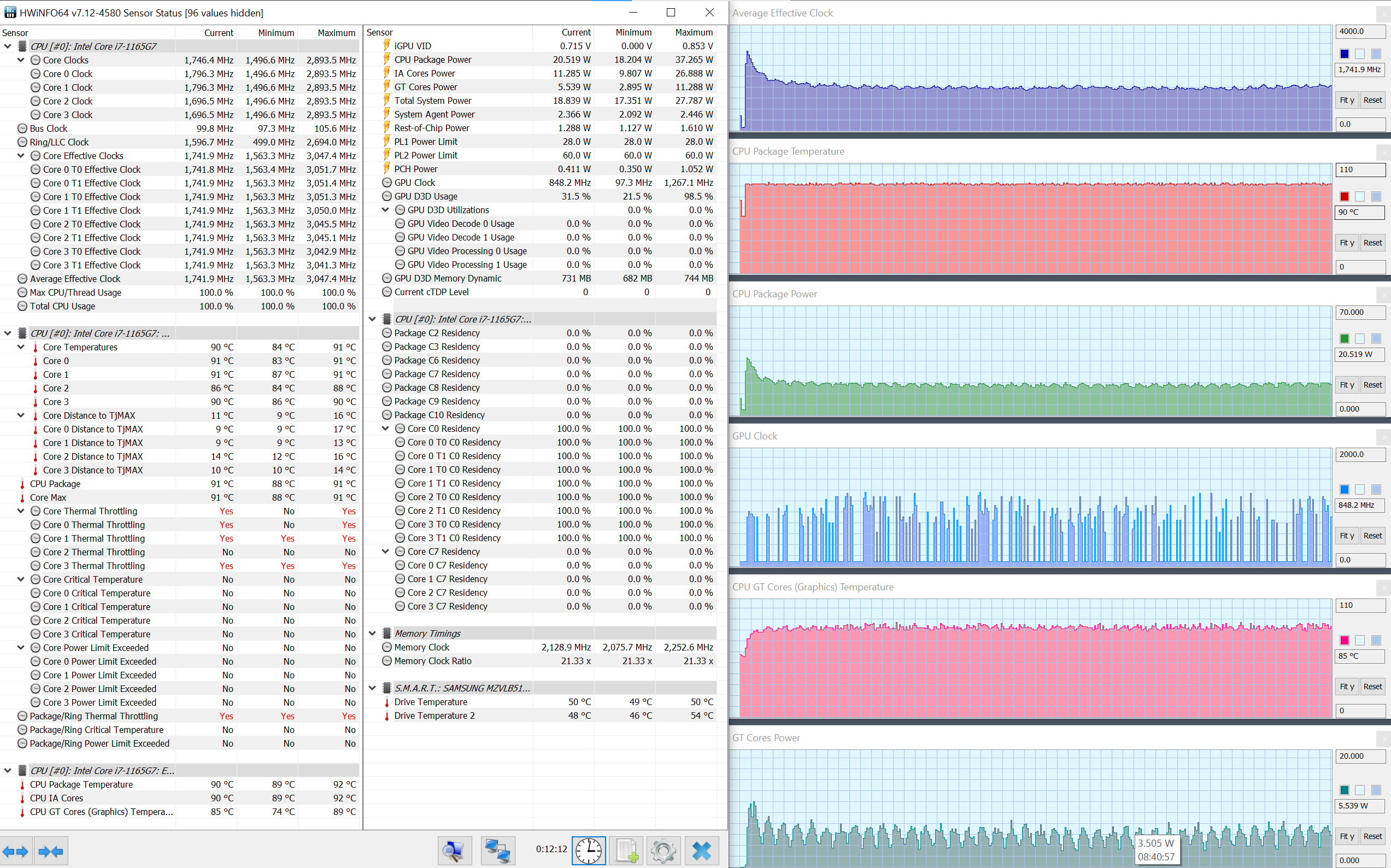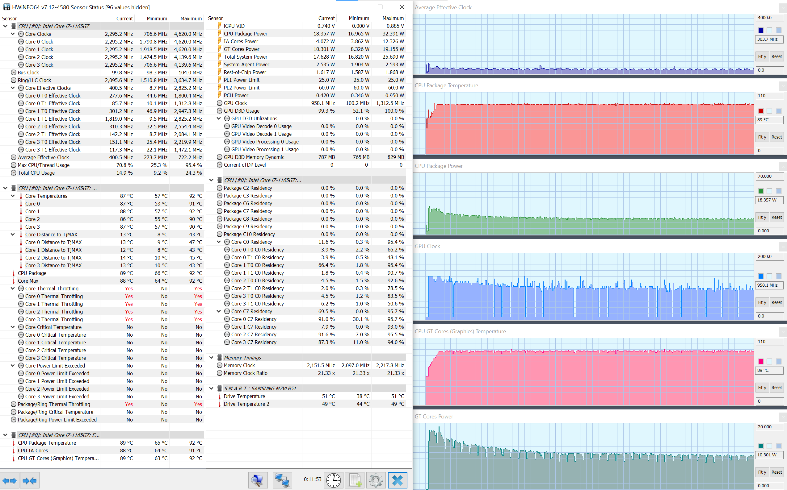 Под максимальной нагрузкой GPU ведет себя предсказуемо, но в первые 20 с «показывает характер»: отмечаются три волны подъема тактовой частоты до 1300 МГц (при этом потребление возрастает до 20 Вт) и последующих снижений на 15%-20%. После третьей волны тактовая частота на 2 секунды сбрасывается до минимального значения (100 МГц), и видеоускоритель начинает вести себя спокойнее. Хотя его попытки разогнаться продолжаются, подъемы тактовой частоты длятся лишь по 1—3 с и перемежаются резкими кратковременными спадами до упомянутого минимума 100 МГц. Потребление продолжает формировать на графике подъемы амплитудой 1—1,5 Вт и длительностью около 6 с (картина напоминает зубчатую стену средневековой крепости), но постепенно съезжает к среднему значению 10 Вт, которое устанавливается примерно к середине 4-й минуты. Температура GPU за первые 10 с тестового прогона достигает 92 °C (это очень много) и далее колеблется в пределах 3 °C. Утилита HWInfo не фиксирует перегрева, но сигнализирует о тротлинге у всех ядер CPU.