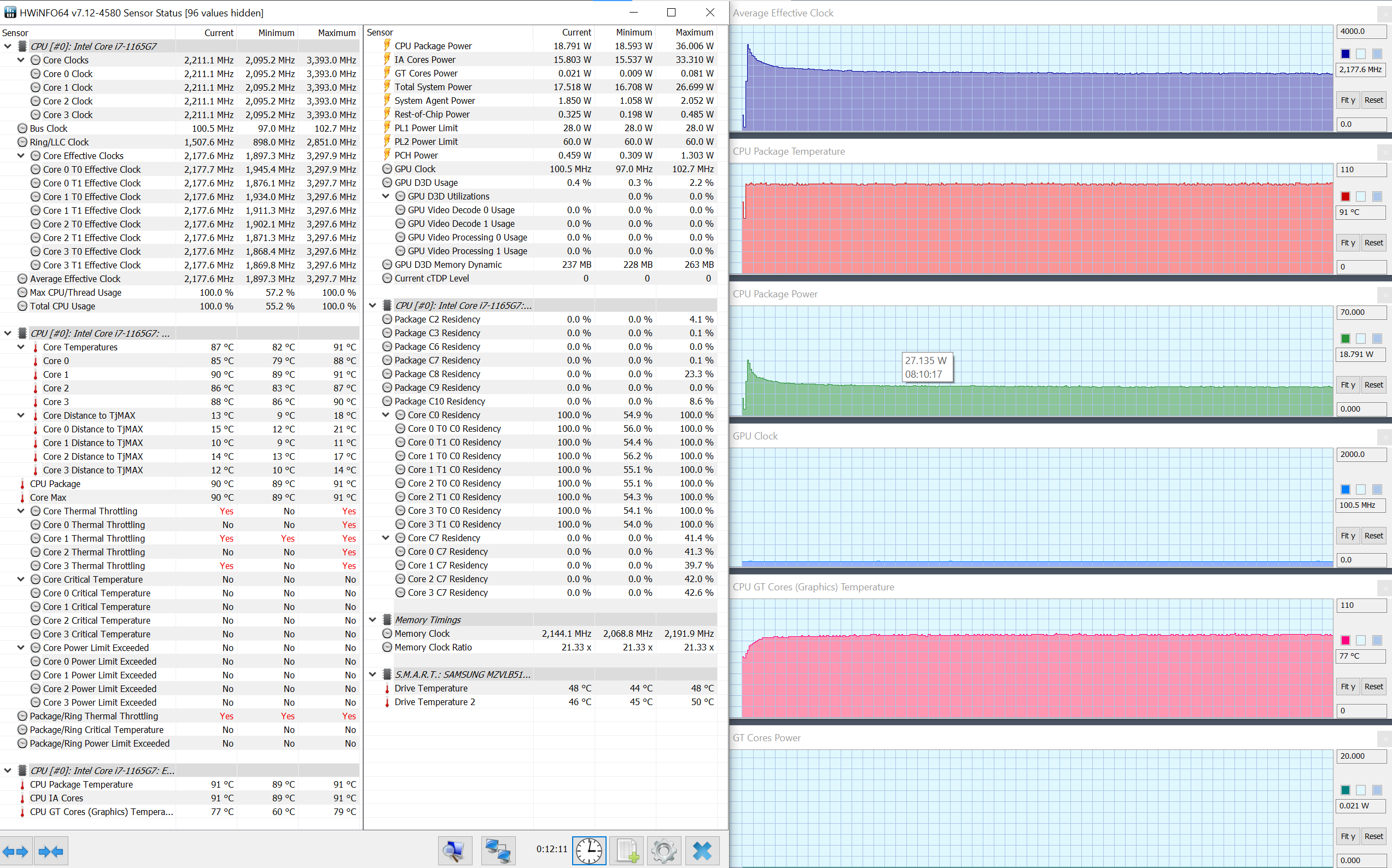 Приложение максимальной нагрузки на центральный процессор порождает ту же картину, что в двух ранее рассмотренных сценариях: первоначальный всплеск тактовой частоты и потребления, затем стабилизация. Огибающая представляет собой уже не гиперболу, а параболу. Достигнутые максимумы первого показателя ниже, а второго — выше, чем в аналогичной ситуации при оптимальном профиле: 3,3 ГГц/36 Вт против 3,5 ГГц/40 Вт. Этот инициальный период длится немного меньше, и стабилизация наступает уже на пятой минуте теста. Температура CPU доходит до 91 °C, но перегрева не наблюдается, зато в пакете процессора и во всех его ядрах (поочередно либо одновременно) отмечается тротлинг. Шум вентилятора слышен, но не мешает при работе.