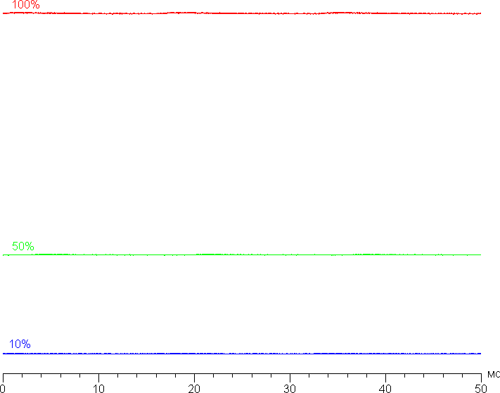 При максимальной нагрузке на видеоускоритель тактовая частота колеблется в тех же пределах, что и при оптимальном сценарии (от 100 до 1300 МГц) при почти таком же потреблении (максимум 19 Вт, а при стабилизации — колебания от 8 до 10 Вт) с аналогичной картиной «зубчатой стены». При этом температура GPU после короткого начального периода постоянно держится на уровне 89—92 °C.
