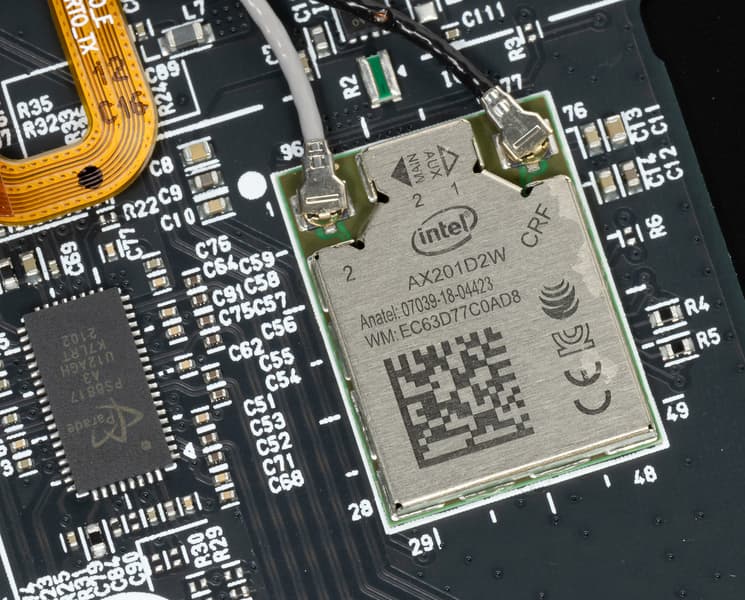 Неизвлекаемый адаптер беспроводной связи Intel AX201D2W поддерживает высокие скорости обмена данных по Wi-Fi 6 и обеспечивает подключение внешних устройств по Bluetooth 5.1.