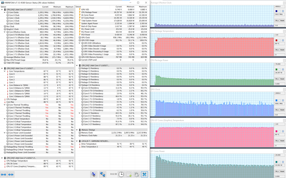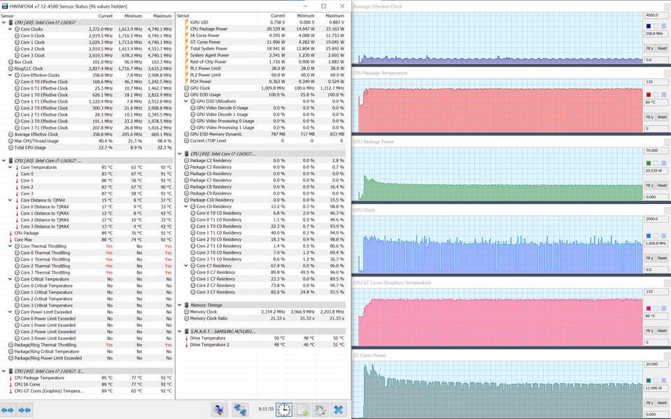 При одновременной нагрузке на CPU и GPU картина аналогична той, которую мы видели в оптимальном профиле, но тактовые частоты и потребление у обоих вычислителей больше. Однако при стабилизации частота процессора удерживается на уровне 1,7 ГГц, потребление — 21 Вт (это ниже паспортных 2,8 ГГц и 28 Вт). В трех ядрах из четырех возникает тротлинг, хотя перегрева, как и ранее, не наблюдается. Вентилятор работает на повышенных оборотах, но создаваемый шум практически не выходит за границы условно комфортного.