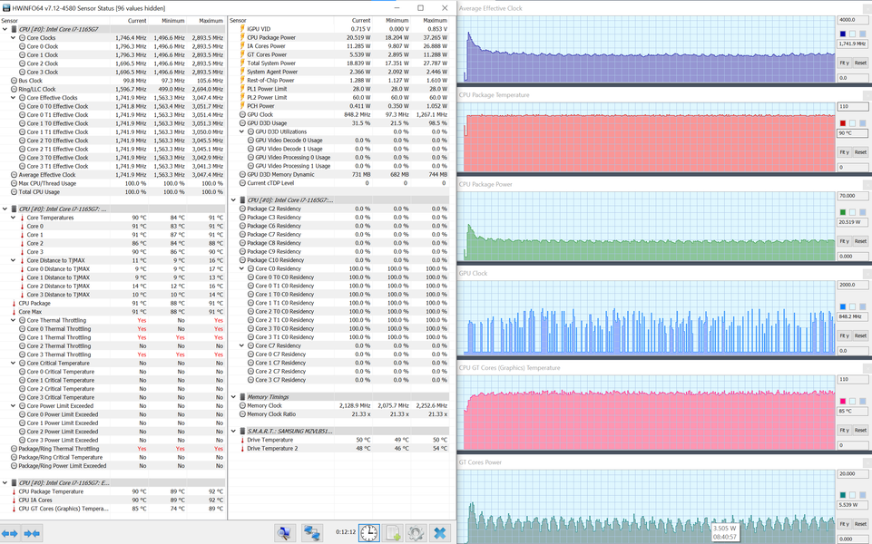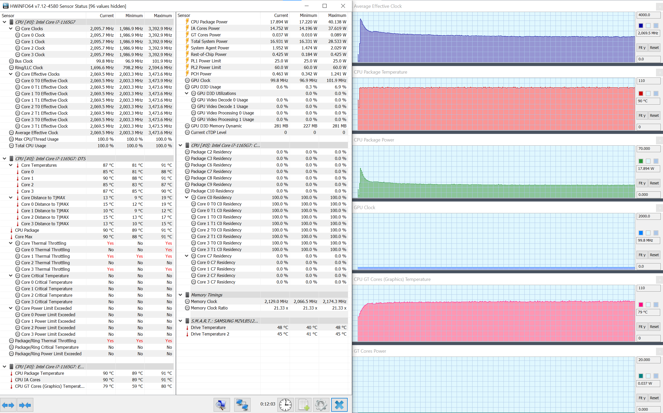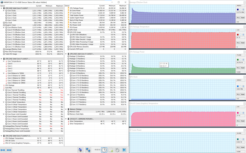 Под максимальной нагрузкой на процессор тактовая частота последнего в коротком начальном периоде взлетает до 3,5 ГГц с одновременным броском потребления до 40 Вт. Спустя всего 6 секунд оба этих показателя понижаются: в первой фазе очень быстро, а затем очень медленно. Огибающая напоминает график гиперболической функции с тем отличием, что примерно на отметке 30 секунд происходит второй подброс частоты и потребления, но на этот раз весьма малый по амплитуде. Он разрывает гиперболу вскоре после начала ее пологого нисходящего сегмента. На четвертой минуте теста оба показателя стабилизируются на отметках 2 ГГц и 18 Вт (это значительно ниже паспортных значений процессора Intel Core i7-1165G7) и далее удерживаются на этих отметках до самого конца. Температура в первую же секунду возрастает до 90 °C и далее колеблется в пределах ±1 °C. Шум вентилятора слышен, но по громкости слишком мал, чтобы его замечать.