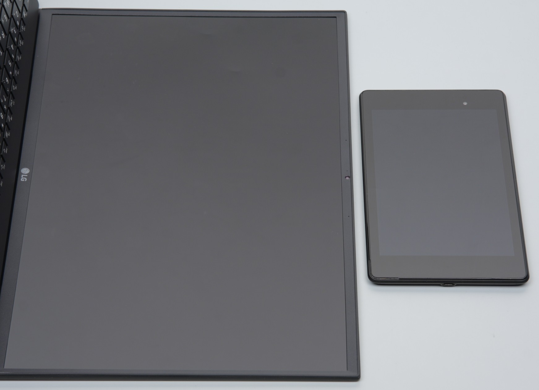 Экран у ноутбука немного темнее (яркость по фотографиям 93 против 107 у Nexus 7), однако разница невелика, то есть специального антибликового покрытия у экрана нет. Никакого существенного двоения отраженных в экране объектов мы не обнаружили, значит воздушного промежутка в слоях экрана также нет.