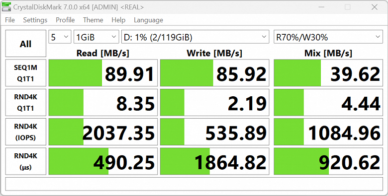 Для SSD-накопителей предусмотрено два слота M.2. Второй свободен, а в первом установлено NVMe-хранилище Yangtze YM0500C6 с интерфейсом подключения PCIe 4.0 x4 вместимостью 512 ГБ. Второй слот M.2 расположен рядом и равноценен первому по спецификациям интерфейса, поэтому в оба посадочных места можно установить одинаковые SSDs и организовать массив в виде одного логического устройства из двух физических: либо RAID0 с двухкратным выигрышем в емкости и скоростях чтения/записи, либо RAID1 с дублированием данных для повышения надежности их хранения.