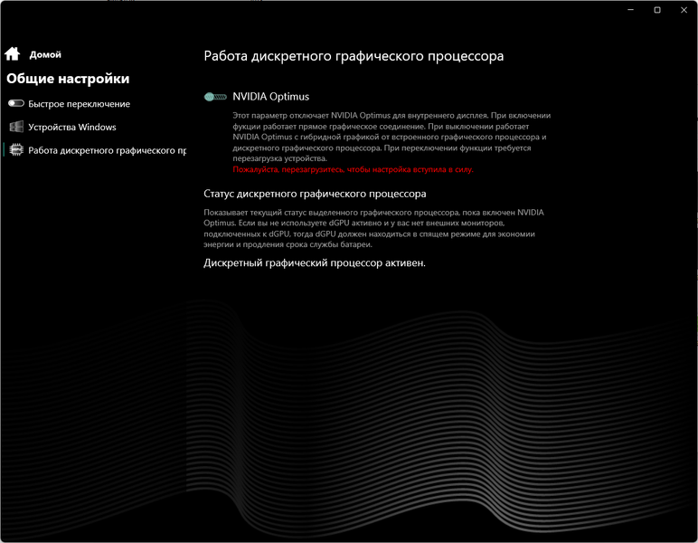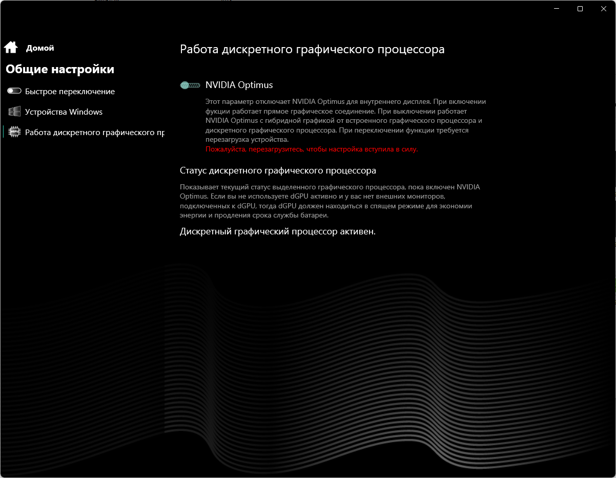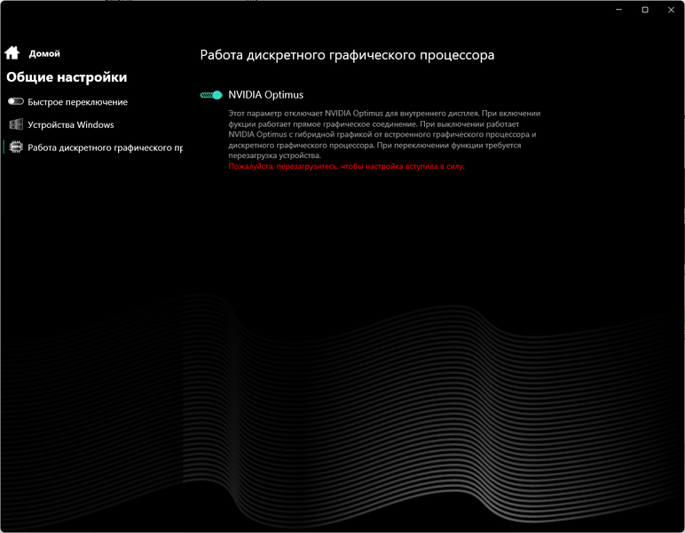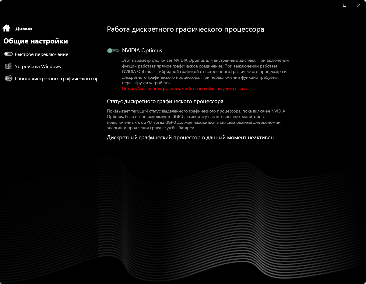 А в третьем («Работа дискретного графического процессора») можно управлять видеоподсистемой, задавая для использования либо дискретную видеокарту, либо автоматический выбор с помощью технологии Nvidia Optimus наиболее подходящей для данного приложения — дискретной Nvidia или интегрированной AMD Radeon; для перехода между режимами потребуется перезагрузка.