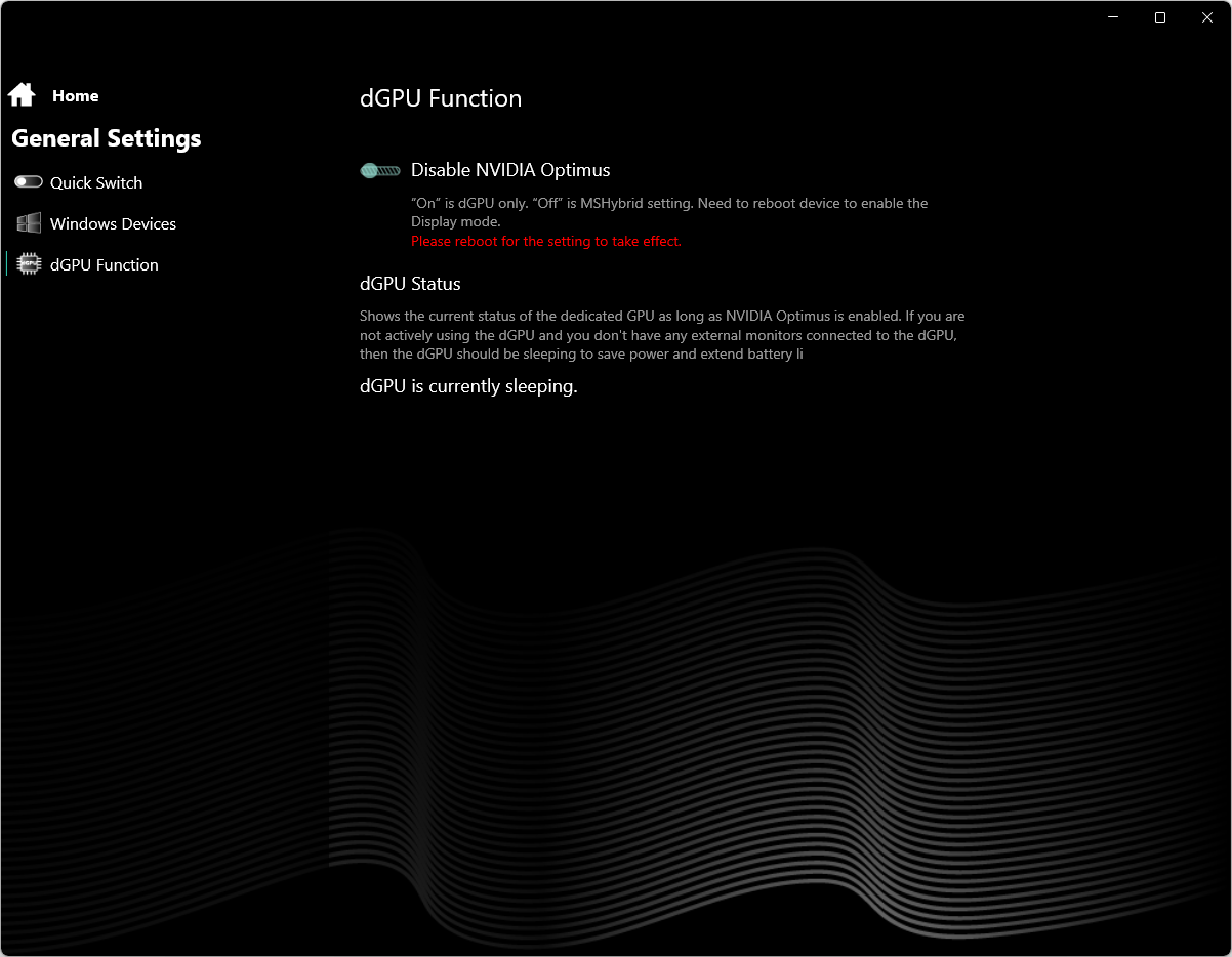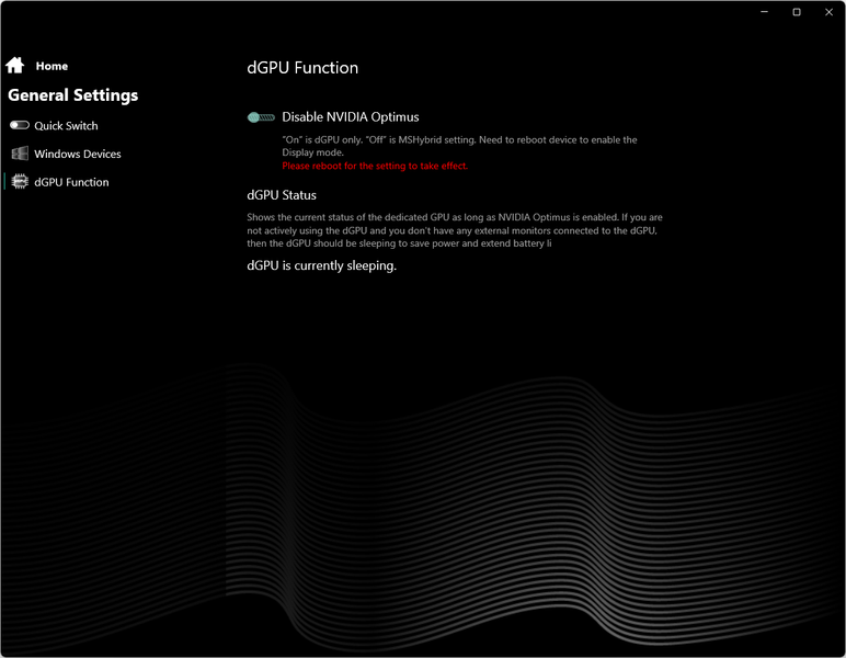 К сожалению, русскоязычный комментарий в окне утилиты неоднозначный, а аппаратной индикации (вроде изменения цвета индикатора включения, как бывает в некоторых ноутбуках) используемого в данный момент видеоадаптера не предусмотрено. Более понятной установка становится при выборе английского языка, но и тут лучше прокомментировать: правое положение движка отключает (Disable) технологию Nvidia Optimus и принудительно задействует дискретную карту.