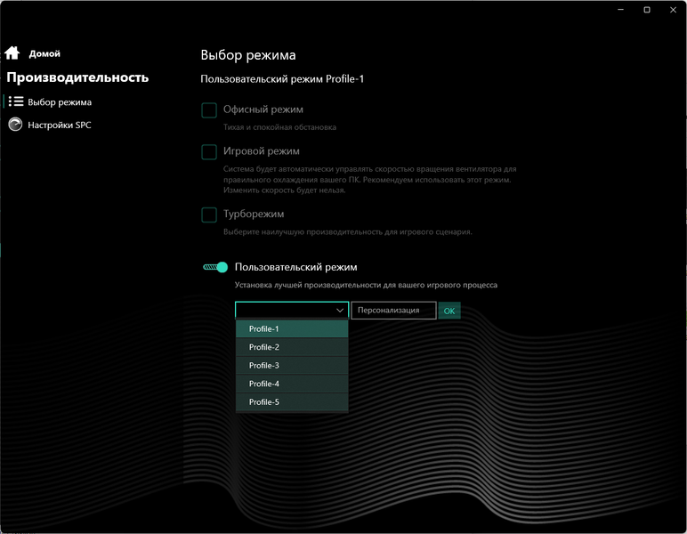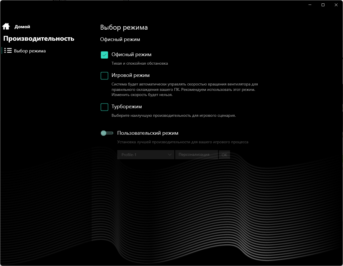 В разделе Производительность выбираются режимы работы: офисный, игровой и Turbo, их смысл поясняется в подписях. Кроме того, есть пользовательские режимы, которые можно настраивать самим.