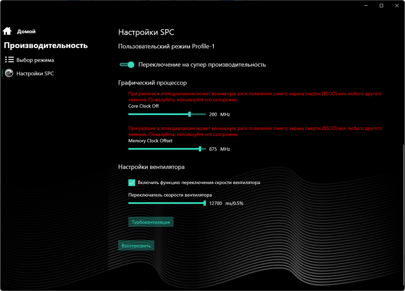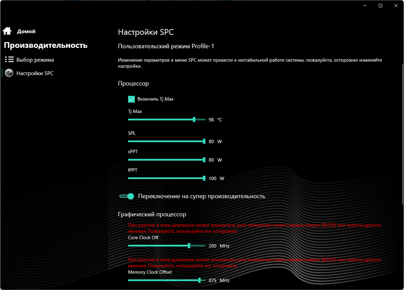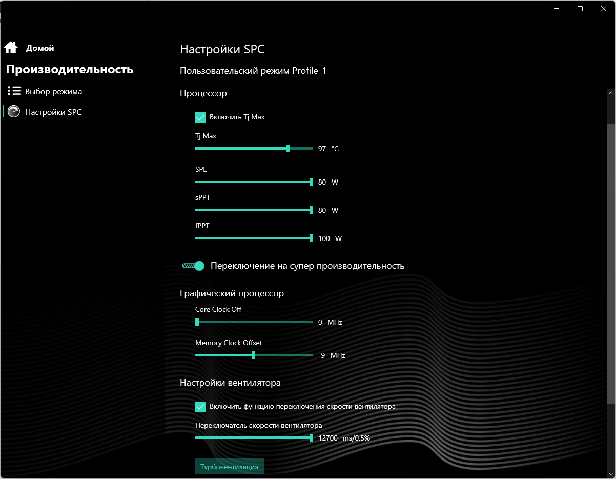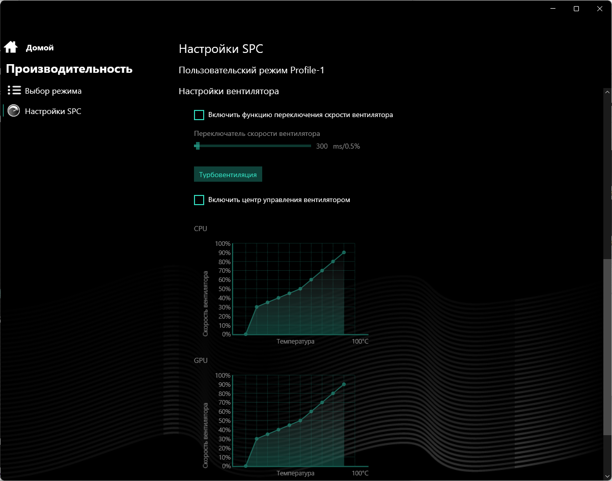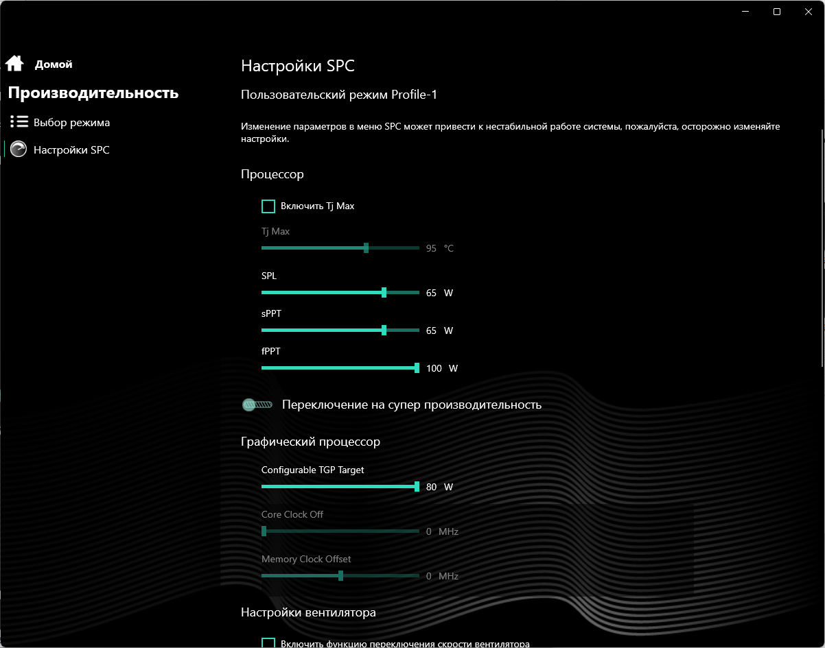 После выбора одного из пользовательских режимов слева появляется дополнительный пункт «Настройки SPC», переход по которому позволит задать некоторые параметры CPU и GPU, а также управлять режимами вентиляторов.