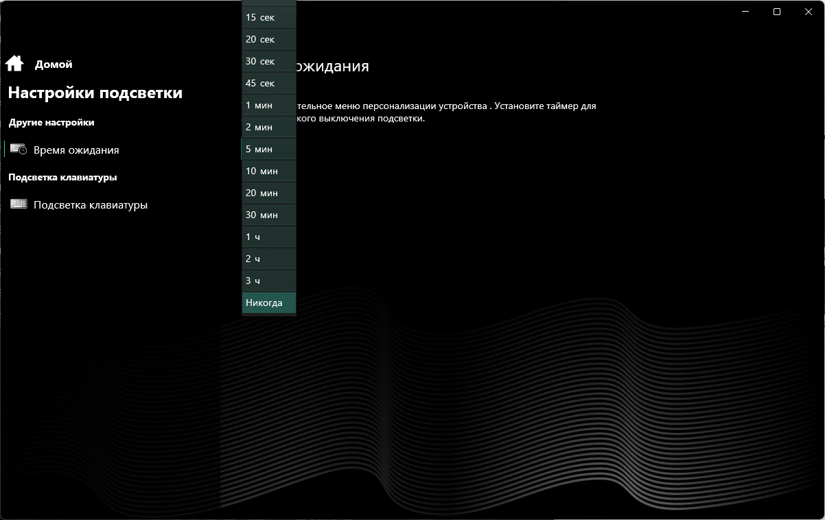 Назначение Настройки освещения понятно — управление подсветкой клавиатуры. Здесь можно выбрать интервал бездействия («Время ожидания»), после которого подсветка автоматически выключится (от 10 секунд до 3 часов, а также никогда); автоотключение подсветки встречается сплошь и рядом, но управление этой функцией бывает далеко не всегда — в недорогих ноутбуках от нее избавиться зачастую нельзя, а уж столь богатый выбор интервалов скорее редкость, чем правило.