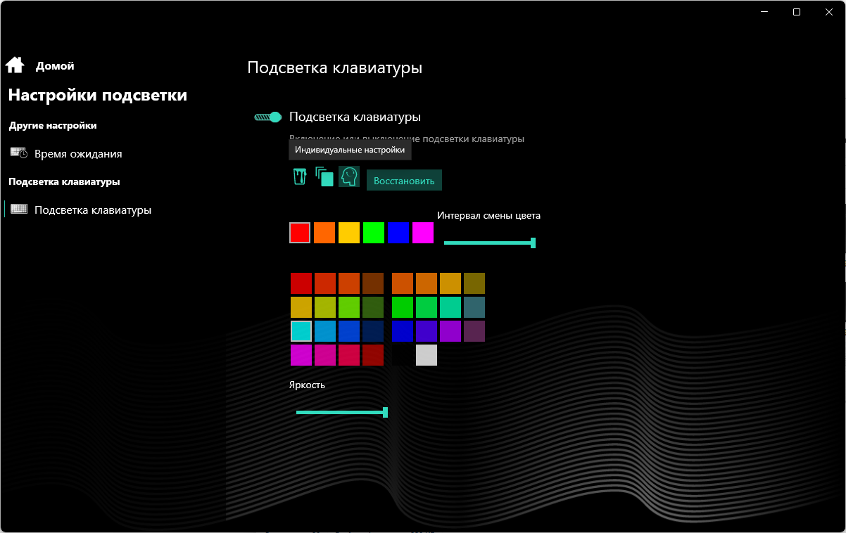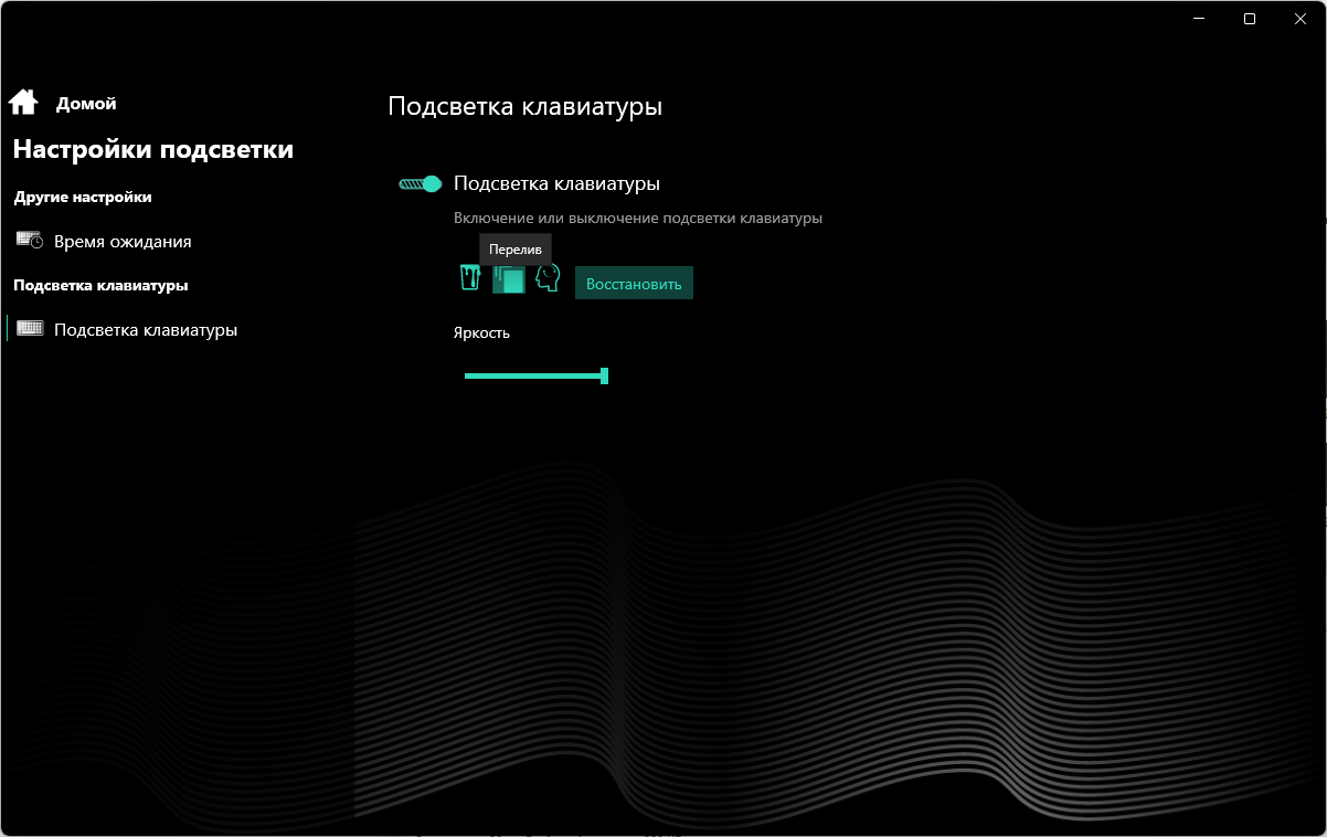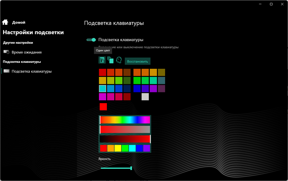 Подраздел «Подсветка клавиатуры» даст возможность выбрать один из трех вариантов подсветки: «Один цвет» — выбираемым цветом с заданием яркости, «Перелив» — плавная смена цветов (регулируется только яркость) и «Индивидуальные настройки» — то же, что и «Перелив», но можно задавать не только яркость, но также набор цветов и интервал их смены. Есть также кнопка сброса на установки по умолчанию.