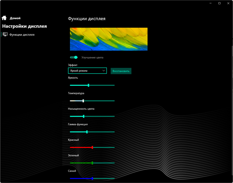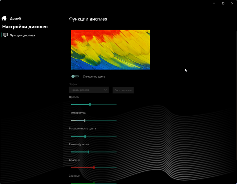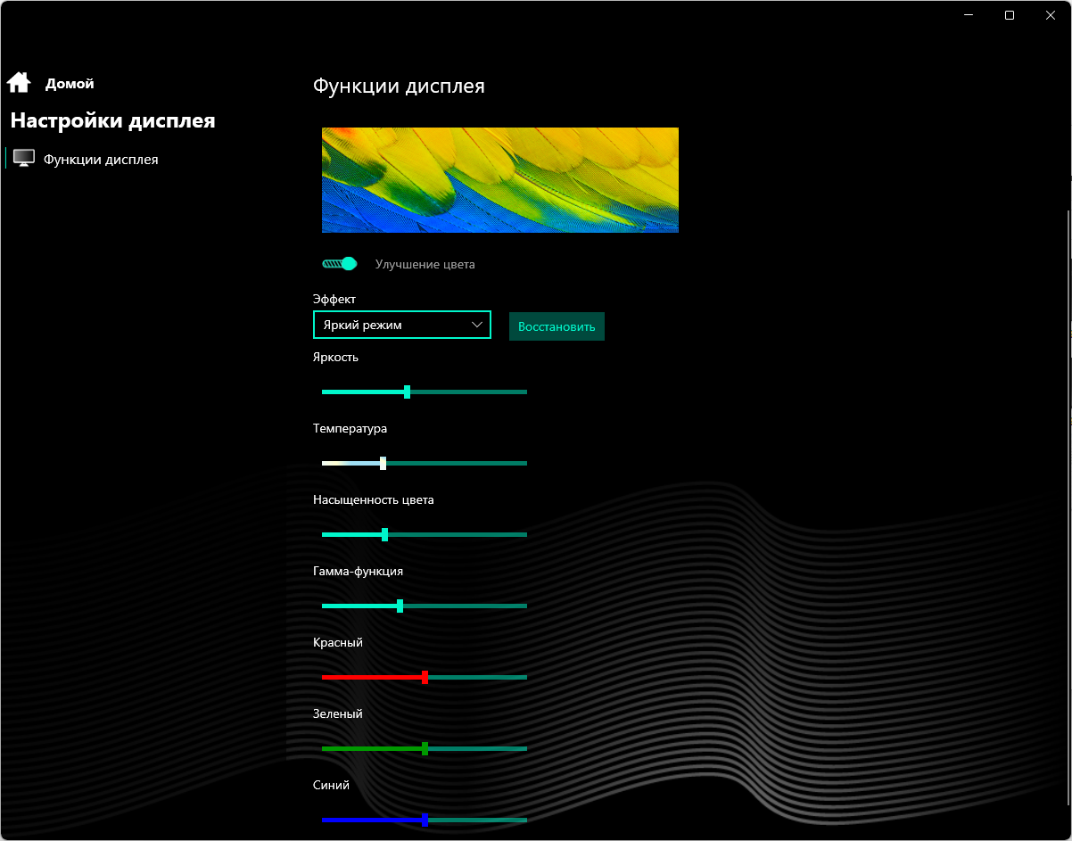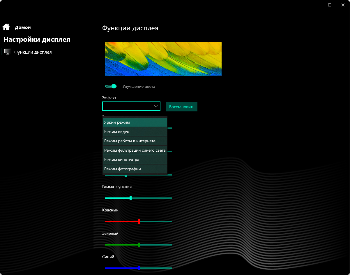 Настройки дисплея: если сдвинуть вправо движок «Улучшение цвета», то станут доступны различные регулировки, перечень которых есть на скриншоте. Можно пользоваться набором готовых профилей, выбирая наиболее подходящий для конкретного сценария использования ноутбука, или менять настройки вручную.