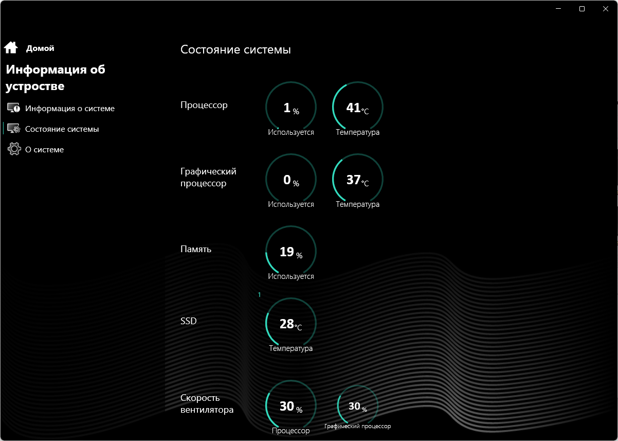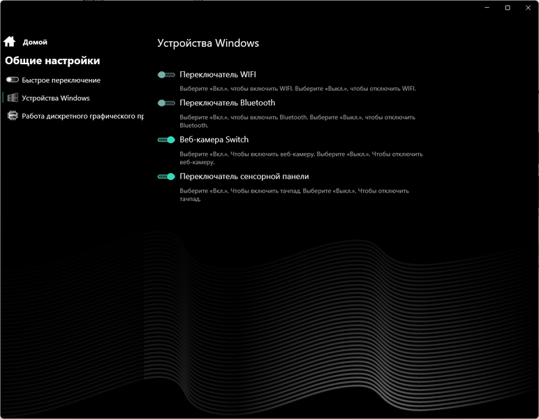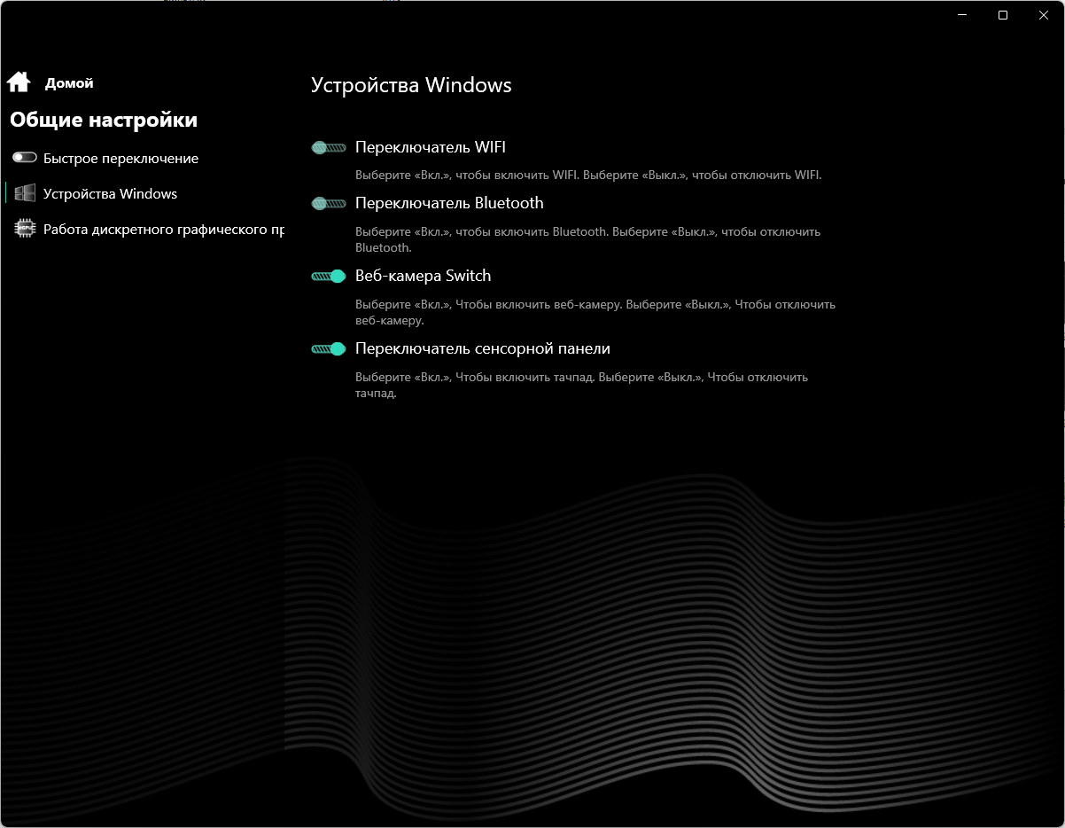 Фирменная утилита позволит контролировать состояние ноутбука, менять некоторые параметры и режимы, управлять эффектами подсветки.