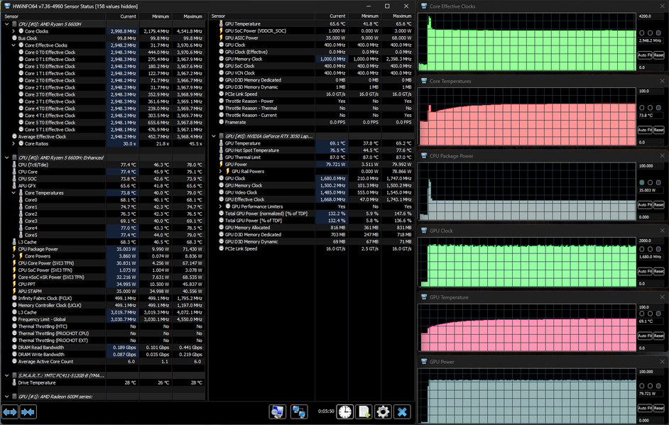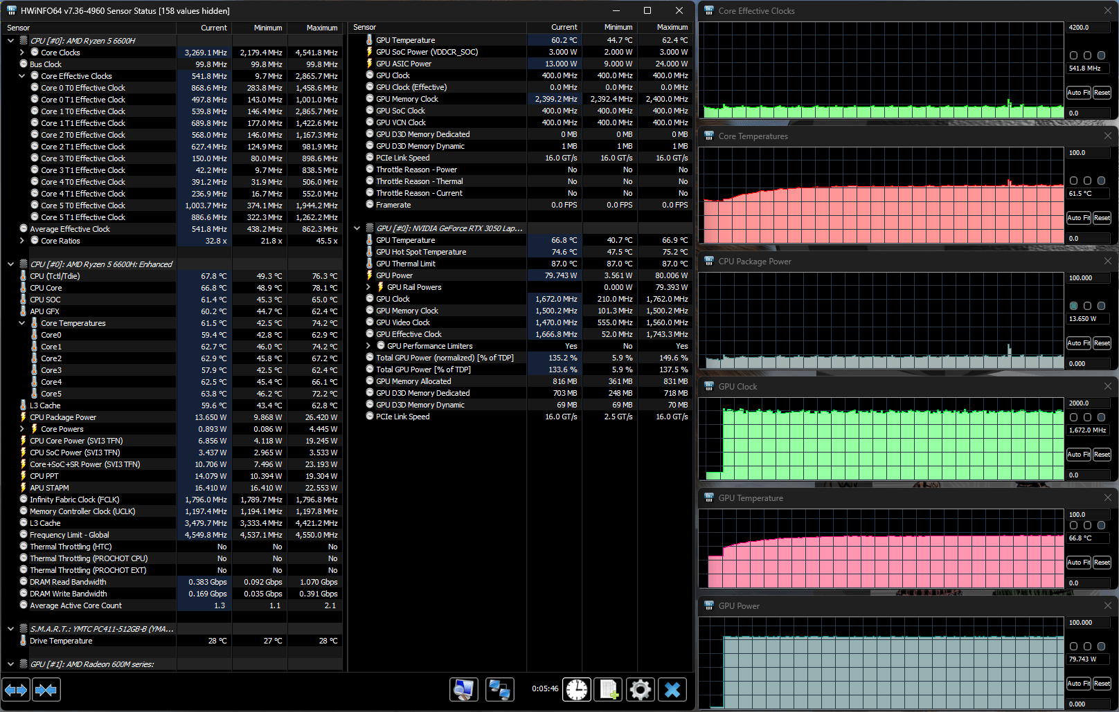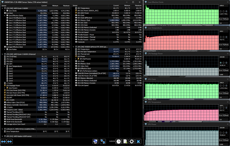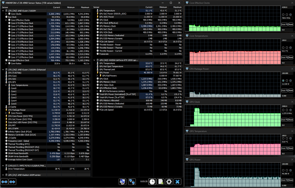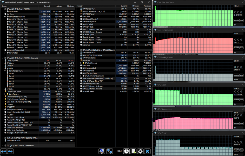 Используемая в данной модели дискретная видеокарта относится к серии Nvidia GeForce RTX 30 в версии для ноутбуков (архитектура Ampere), для GeForce RTX 3050 ее производитель заявляет наличие 2048 шейдерных блоков, 16 RT-ядер и 64 тензорных ядра, 128-разрядную шину памяти с подключением 4 ГБ ОЗУ GDDR6, тактовую частоту (с ускорением) 1057-1740 МГц и потребление 35-80 Вт.