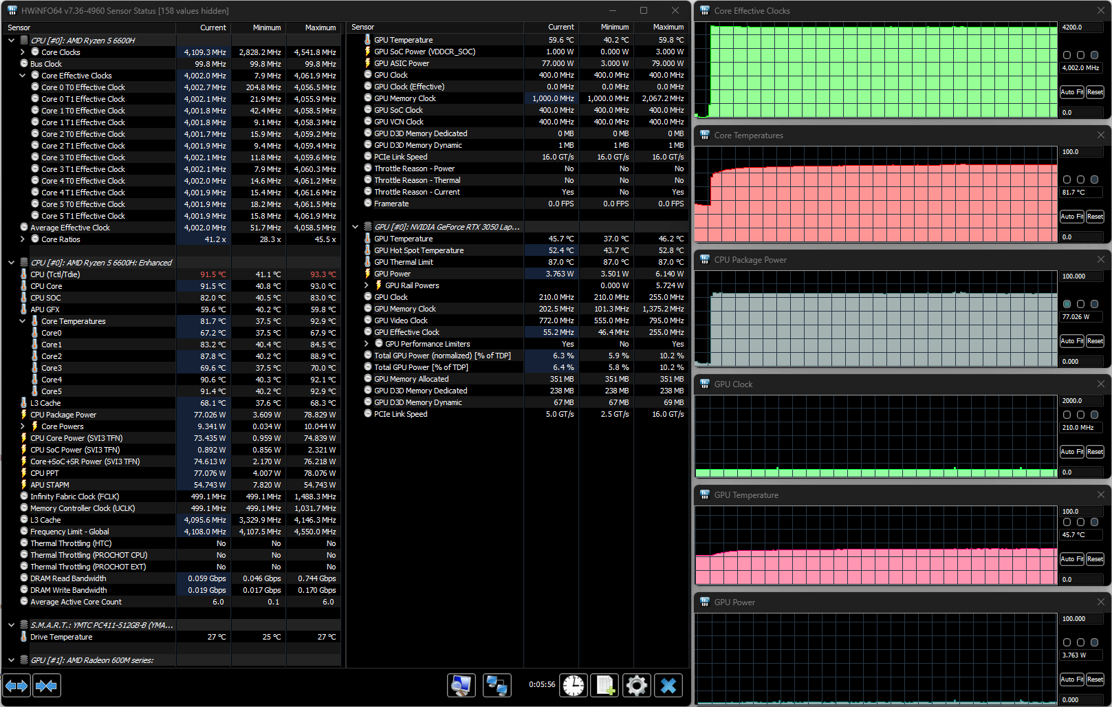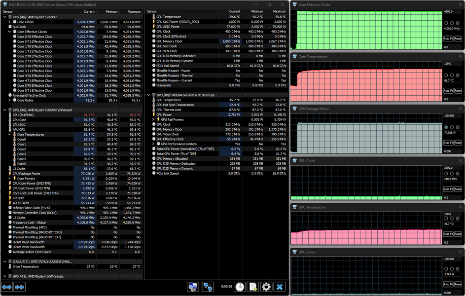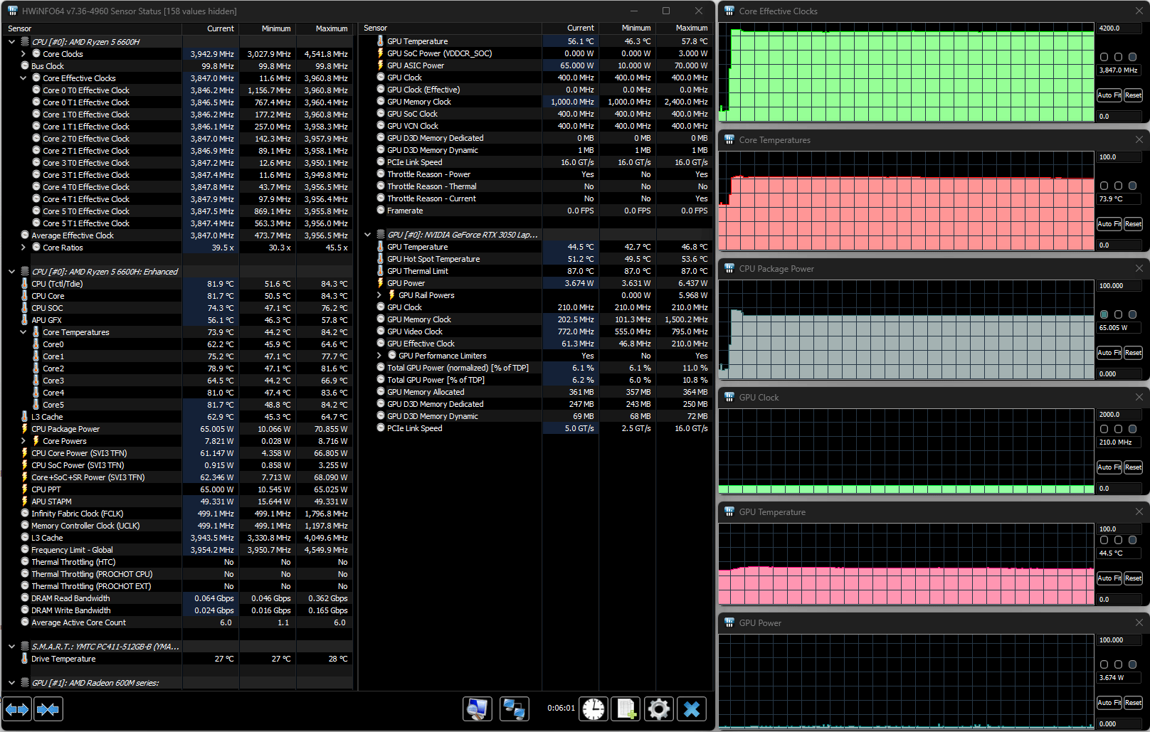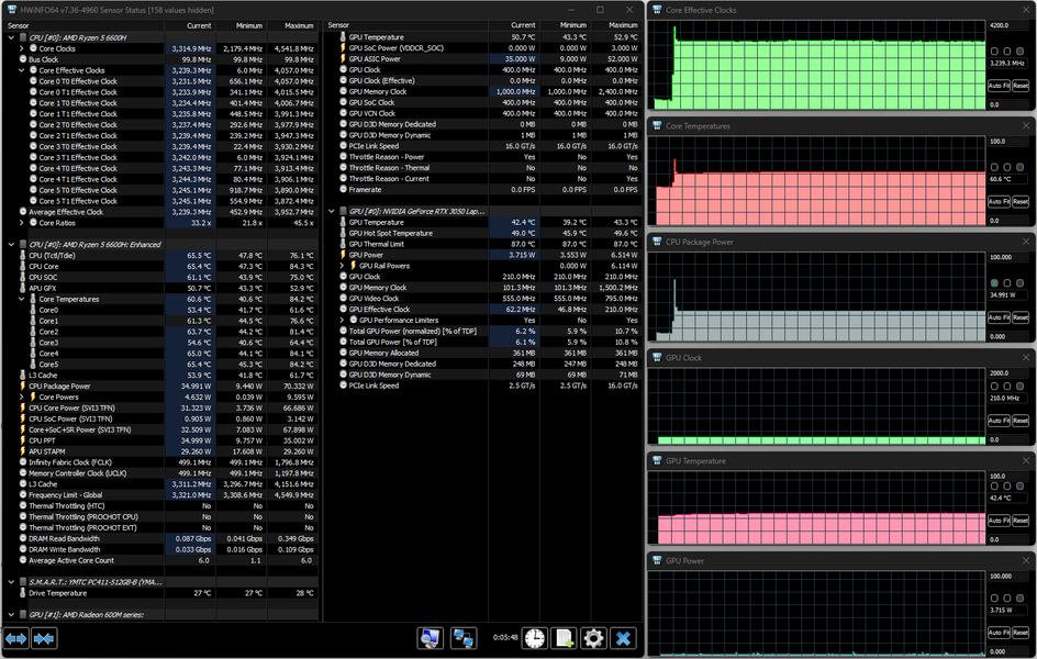 Используемая в данной модели дискретная видеокарта относится к серии Nvidia GeForce RTX 30 в версии для ноутбуков (архитектура Ampere), для GeForce RTX 3050 ее производитель заявляет наличие 2048 шейдерных блоков, 16 RT-ядер и 64 тензорных ядра, 128-разрядную шину памяти с подключением 4 ГБ ОЗУ GDDR6, тактовую частоту (с ускорением) 1057-1740 МГц и потребление 35-80 Вт.