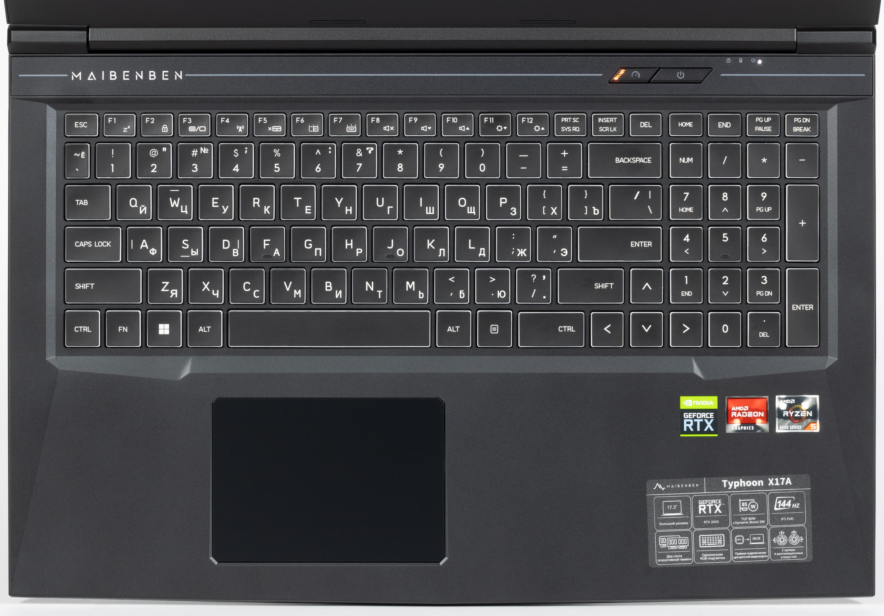 Но в обозначенных на официальном сайте бренда линейках еще немало интересного, одних только серий восемь — по три для дома и для бизнеса, а также две для игр. В этот раз нам досталась игровая модель из серии Typhoon — ноутбук Maibenben X17A (индекс R56035) с 17-дюймовым экраном, процессором AMD и дискретной видеокартой Nvidia. На момент тестирования он предлагался по ценам от 77,5 тысяч рублей, что очень привлекательно, но надо учитывать: сегодня подобная конфигурация соответствует игровым ноутбукам лишь начального уровня.