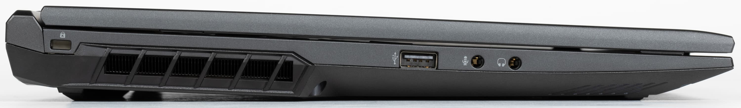 На левом боку имеются отверстие кенсингтонского замка, порт USB 2.0 и два гнезда под миниджеки — для микрофона и для гарнитуры.