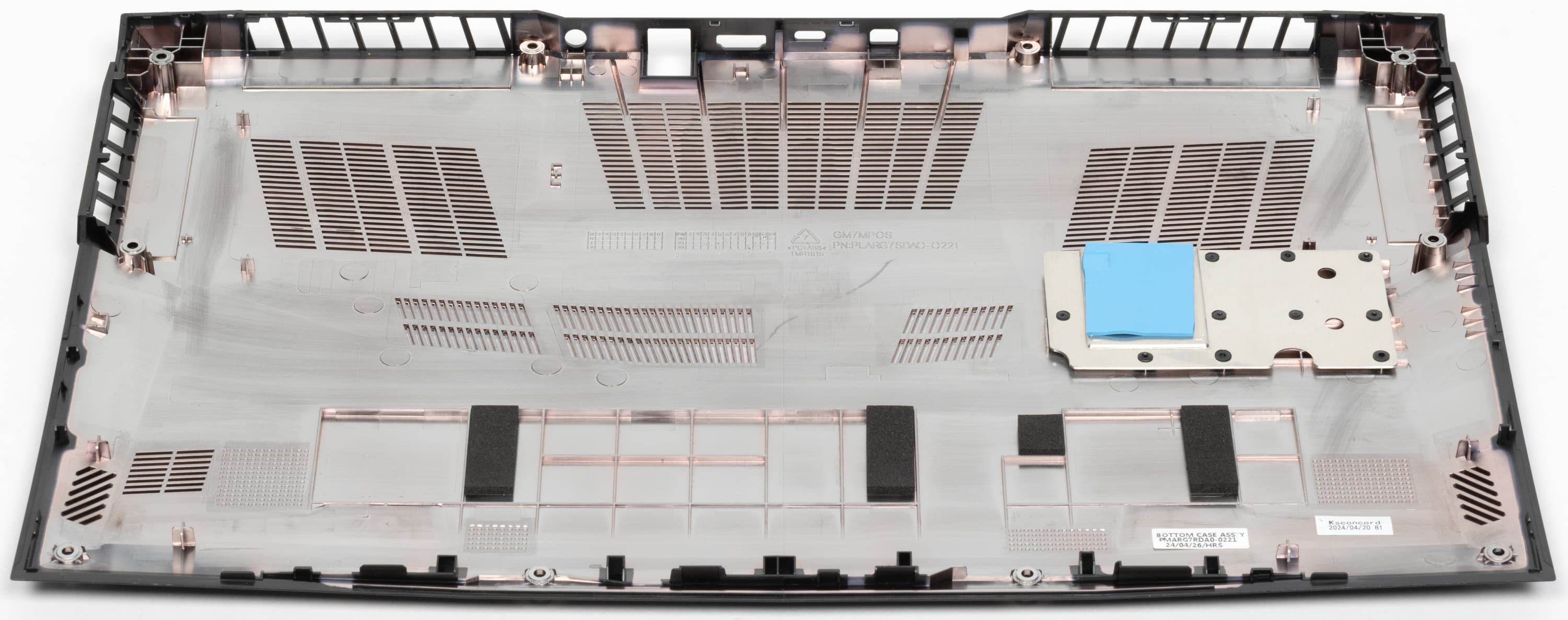 Чтобы снять нижнюю крышку, нужно удалить десять хорошо заметных винтов. Отметим наличие на ее внутренней поверхности оснащенной термопрокладкой металлической пластины в месте расположения накопителей, которая служит для них теплоотводом.