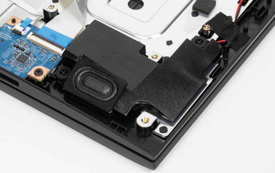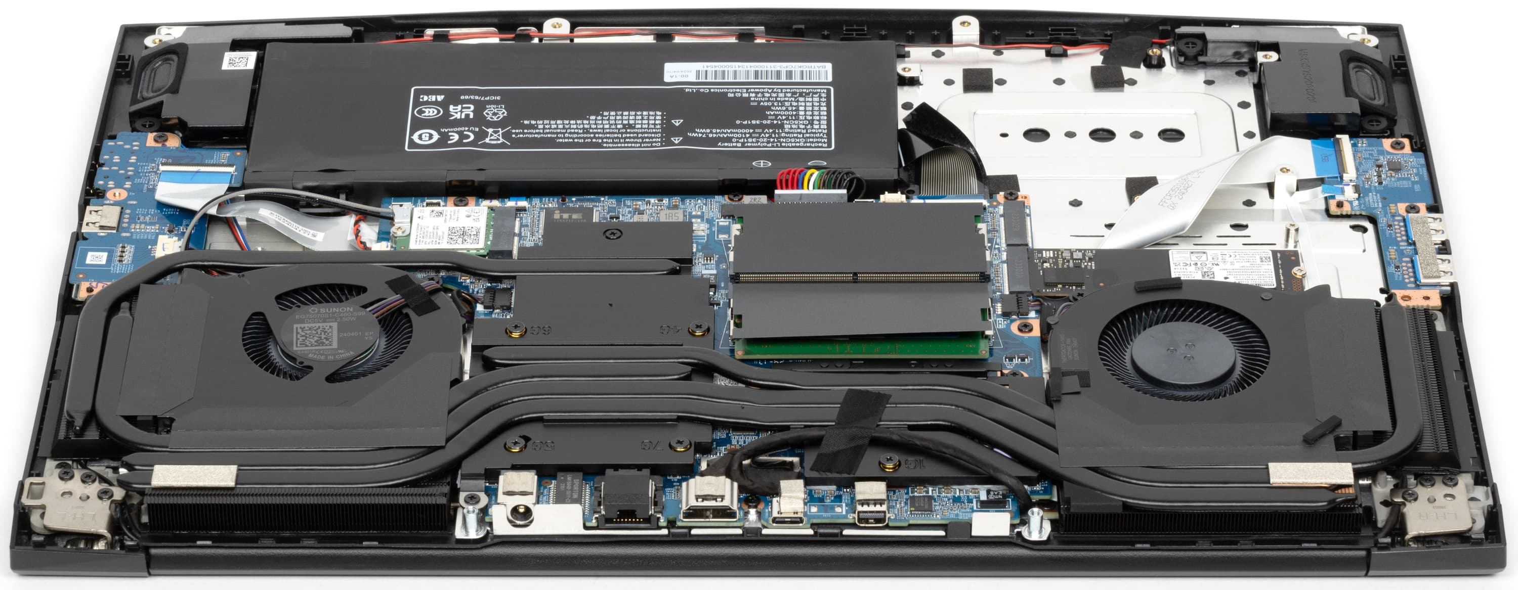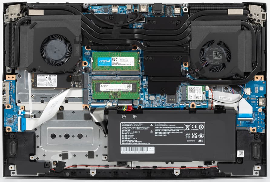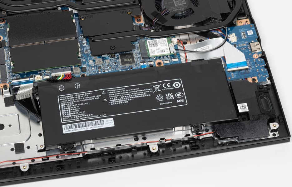 Батарея, состоящая из трех ячеек, занимает не всю ширину корпуса, оставляя по бокам лишь немного места для динамиков. Ее емкость небольшая — 46,74 Вт·ч, хотя вполне можно было поместить батарею с четырьмя ячейками и более высокой емкостью; конечно, при этом неизбежно увеличился бы вес ноутбука, но он и без того далеко не сверхмалый.
