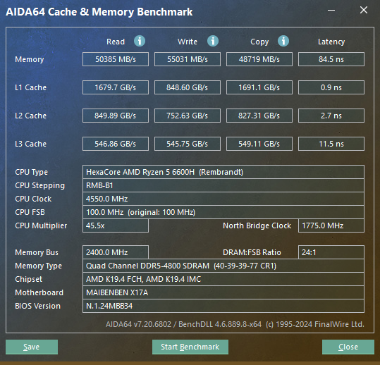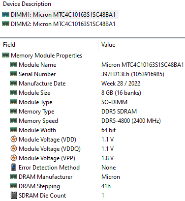 | Оперативная память | 16 ГБ DDR5-4800 (2 × SO-DIMM Micron MTC4C10163S1SC48BA1) максимальный объем памяти 64 ГБ | |