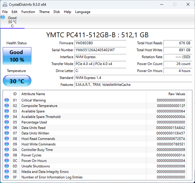 | Накопитель | 1 × SSD 512 ГБ (YMTC PC411-51GB-B, M.2 2280, NVMe, PCIe 4.0 x4) имеется свободный слот M.2 2280 для второго накопителя | |