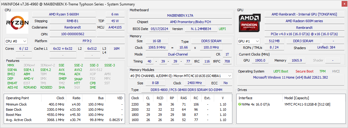 - Maibenben Typhoon X677 c AMD Ryzen 7 7735H (8 ядер/16 потоков, до 3,2/4,75 ГГц, 35-54 Вт), видеокартой Nvidia GeForce RTX 4060 Laptop (8 ГБ GDDR6), ОЗУ 16 (2×8) ГБ DDR5-4800, SSD 512 ТБ PCIe 4.0 ×4.