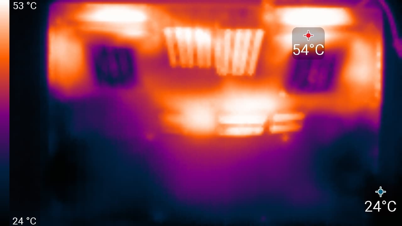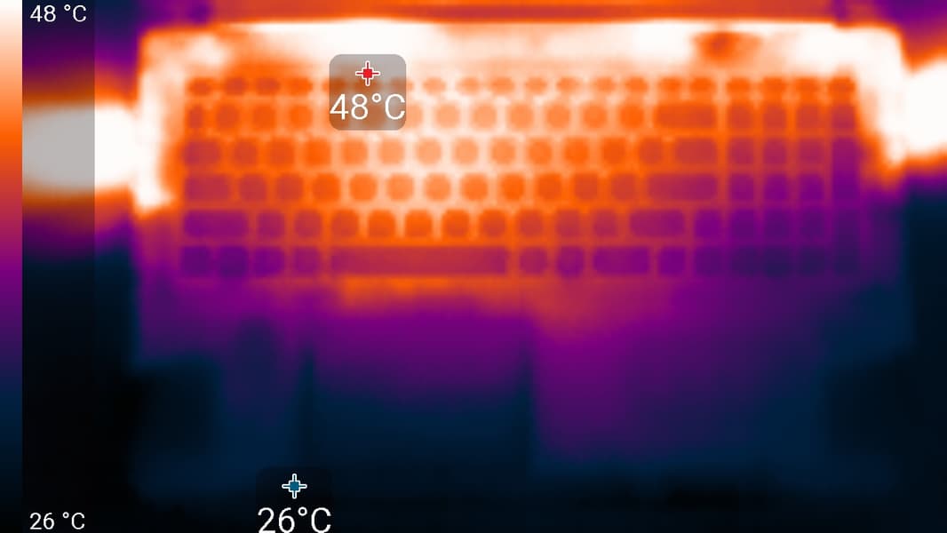 Система охлаждения типична для игрового ноутбука и содержит в своем составе два кулера (по одному для CPU и GPU) с двумя радиаторами у каждого (задним и боковым) и шесть тепловых трубок. Две из них, общие для обоих вычислителей, связывают кулеры в единый контур, поэтому вентиляторы вращаются более-менее синхронно при нагрузке на CPU и GPU. Движение воздушных масс в трактах происходит одновременно в шести направлениях: относительно холодный забортный воздух поступает двумя потоками через отверстия в днище, а выброс горячего производится вентиляторами через четыре радиатора и их решетки (две назад, направо и налево).