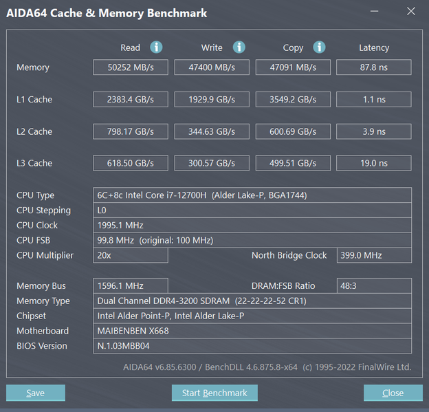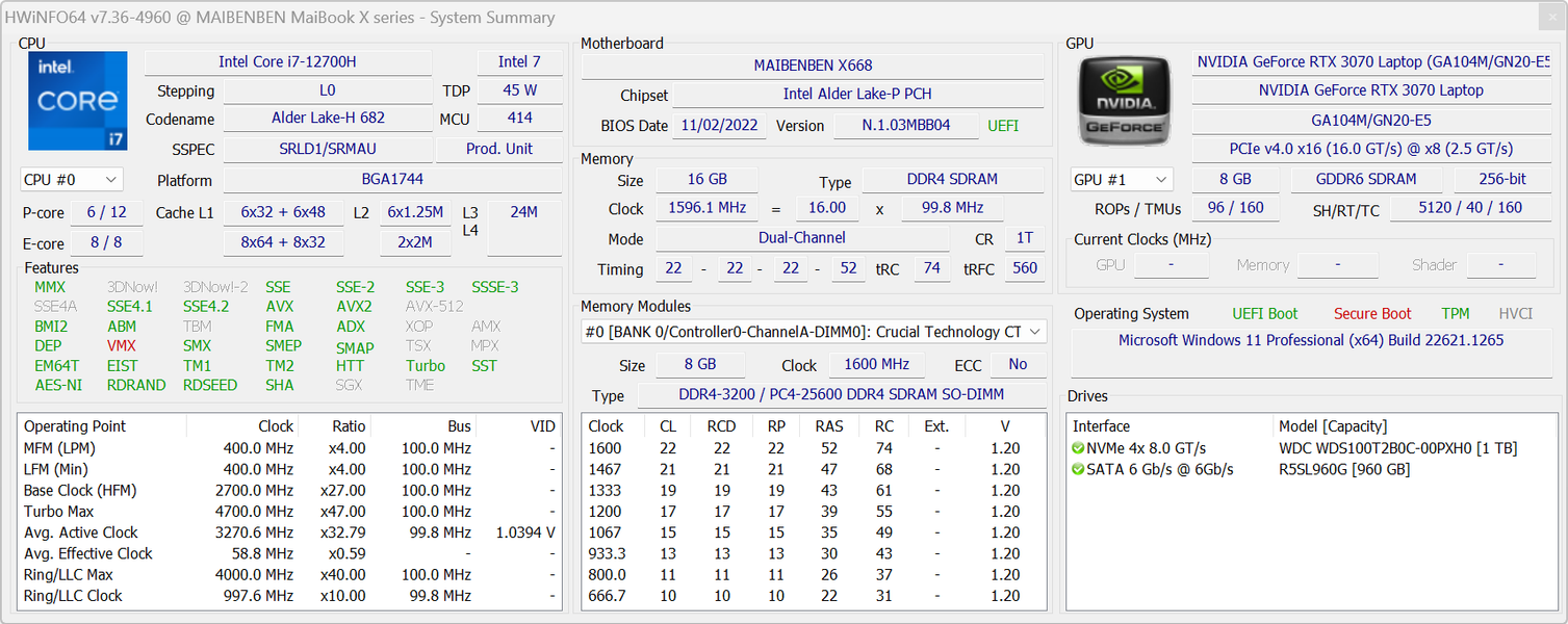 Испытанный нами инженерный сэмпл игрового ноутбука Maibenben обладает IPS-экраном 17,3 дюйма по диагонали и оснащен самым распространенным на сегодняшний день дуэтом вычислителей: Intel Core i7-12700H + Nvidia GeForce RTX 3070 Laptop. Во всем, что касается аппаратного костяка (barebone), содержащего постоянные компоненты (не подлежащие замене), конфигурация вполне современная и неплохо подобранная: цельнометаллическое шасси, два слота для работы модулей оперативной памяти SO-DIMM в двухканальном режиме (можно установить до 64 ГБ включительно), максимально возможный объем памяти видеокарты (8 ГБ GDDR6), два равноценных слота для NVMe-накопителей, LAN-адаптер 2,5 Гбит/с, два аудиоразъема (с поддержкой цифрового выхода S/PDIF), адекватный набор портов USB 3.1 Gen1 и Gen2, в том числе с выводом видео на внешний монитор посредством USB Type C (DisplayPort 1.4). По сумме аппаратных достоинств Maibenben X668 выигрывает у конкурентов: дисплей — по разрешению (2560×1440), яркости (387 кд/м²), времени отклика (5 мс) и широте охвата цветового пространства sRGB, батарея — по длительности автономной работы (5,5 ч при работе с текстом) и скорости восполнения заряда (менее часа до 80%), система охлаждения — по самому низкому уровню производимого шума. На этом фоне несколько неуверенно выглядит системный накопитель, который хотелось бы видеть более современным и быстродействующим. Впрочем, для игр это не столь важно.