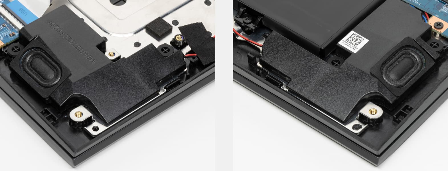 Начнем с того, что мы только что сняли, — с нижней крышки, то есть днища. В отличие от аналогичных деталей в других портативных машинах, она выполняет не только пассивную (механическую), но и активную роль: на ней установлен радиатор с термопрокладкой, предназначенный для отвода тепла от твердотельных накопителей. Несмотря на то, что эта деталь несъемная, ее наличие — очевидный плюс, за что мы благодарим создателей ноутбука.