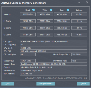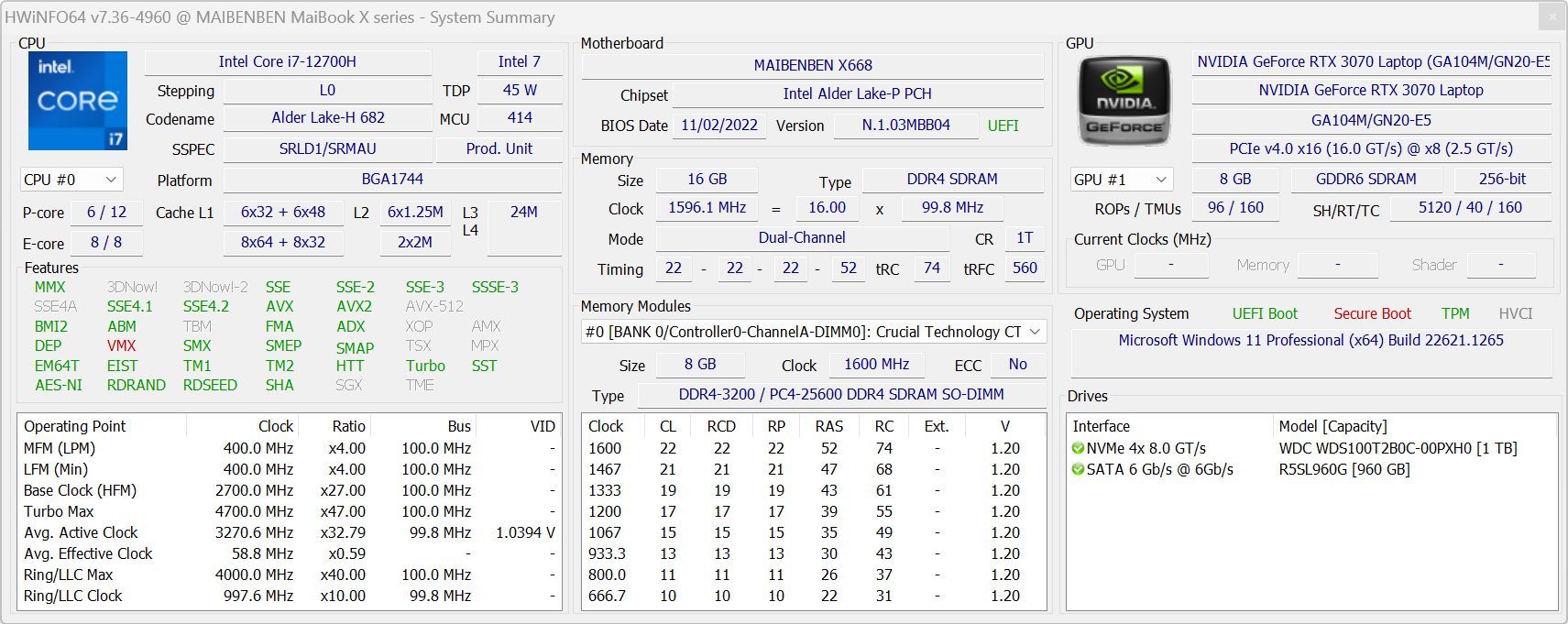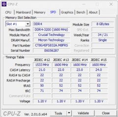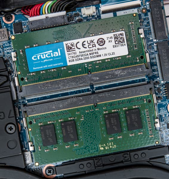 Ноутбук оснащен процессором, который умеет работать с оперативной памятью DDR5-4200. Однако подопытный экземпляр оснащен SO-DIMM предыдущего поколения (DDR4-3200) в виде двух равноценных модулей Crucial/Micron CT8G4SFS832A по 8 ГБ, благодаря чему память работает в двухканальном режиме.