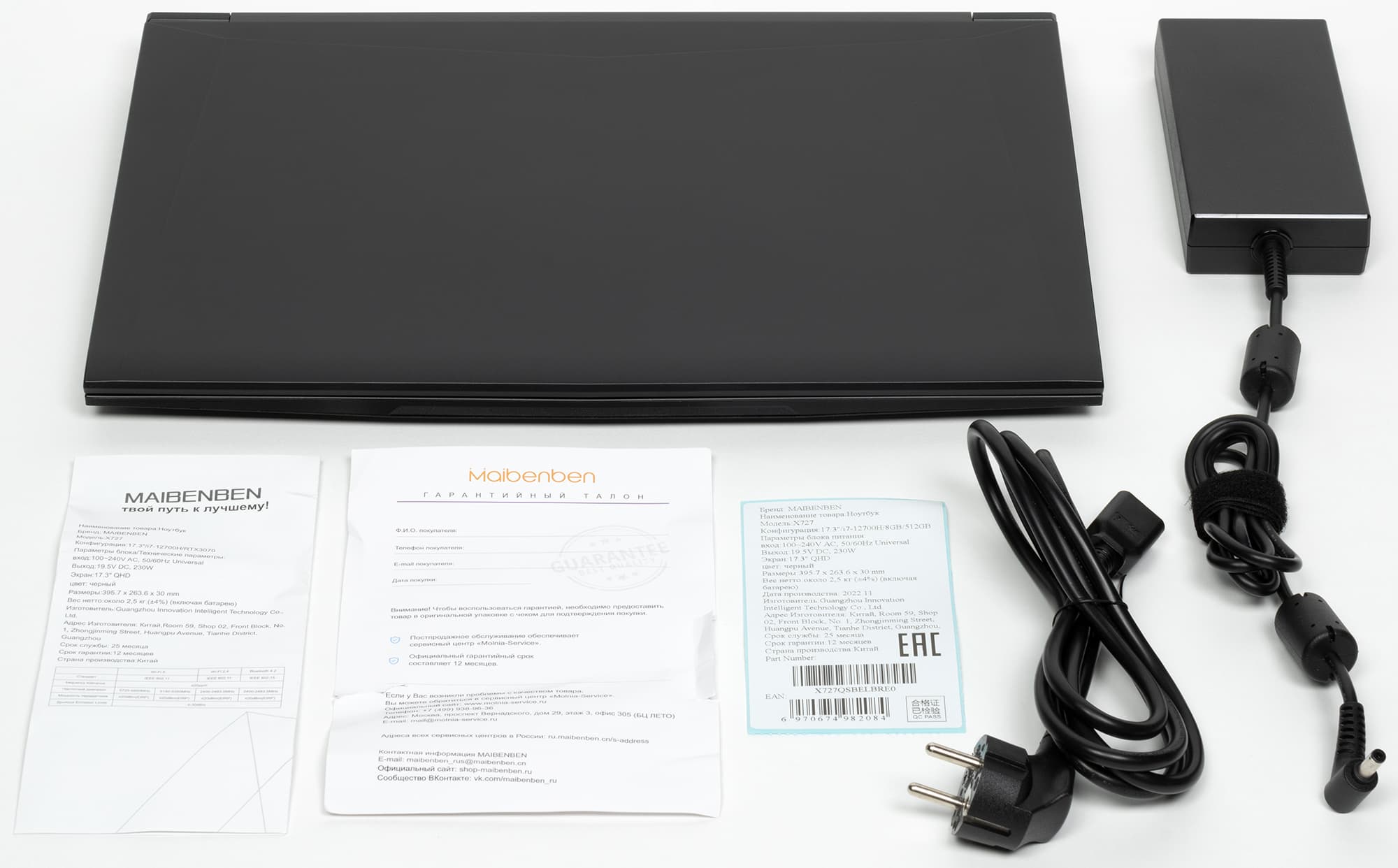 В коробке обнаруживаются сам ноутбук, адаптер питания, который подходит для работы от сети переменного тока 50/60 Гц под напряжением 100—240 В и обеспечивает на выходе 20 В при силе тока 11,5 А (мощность 230 Вт), гарантийный талон и листовки с техническими данными.