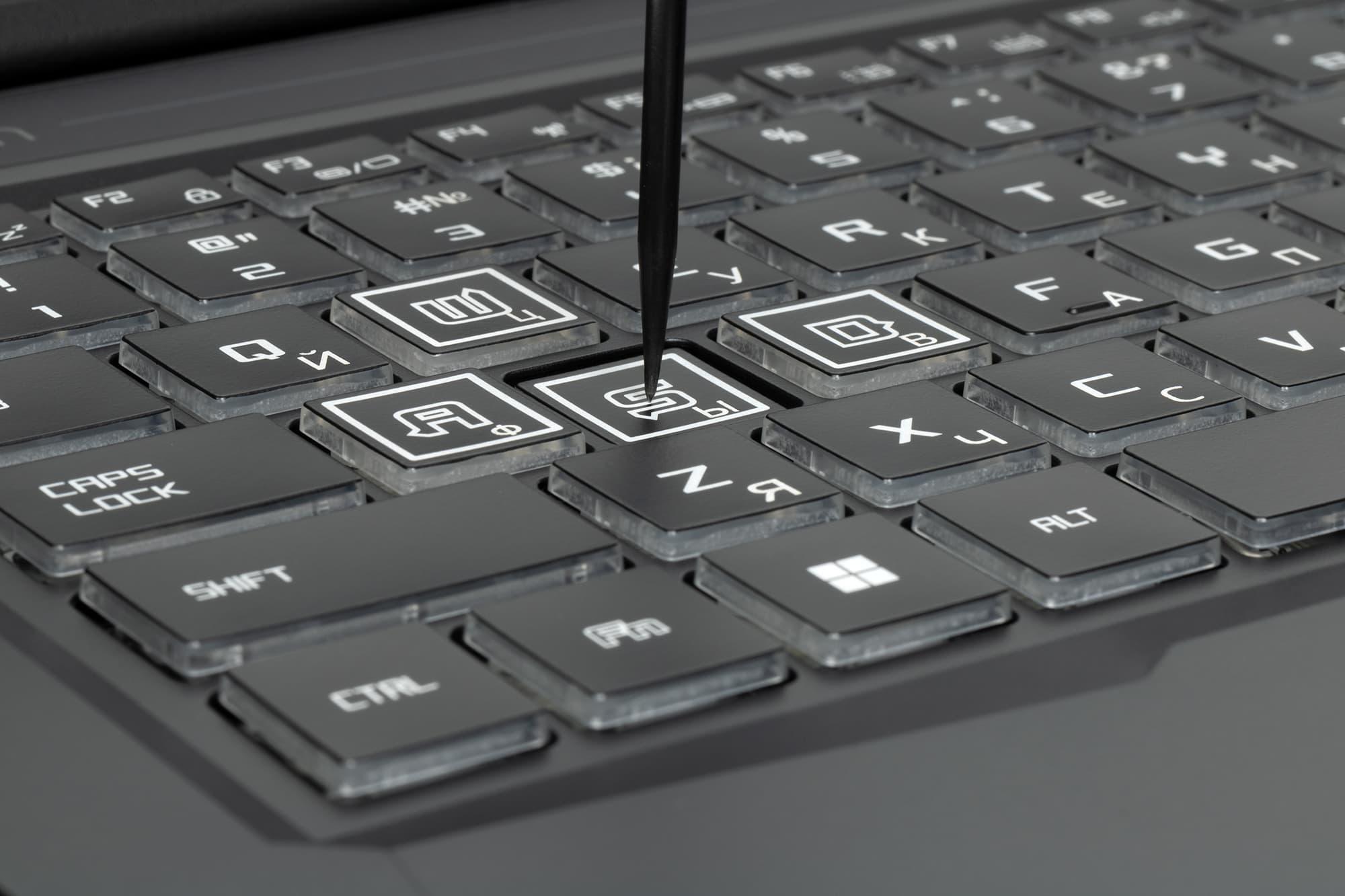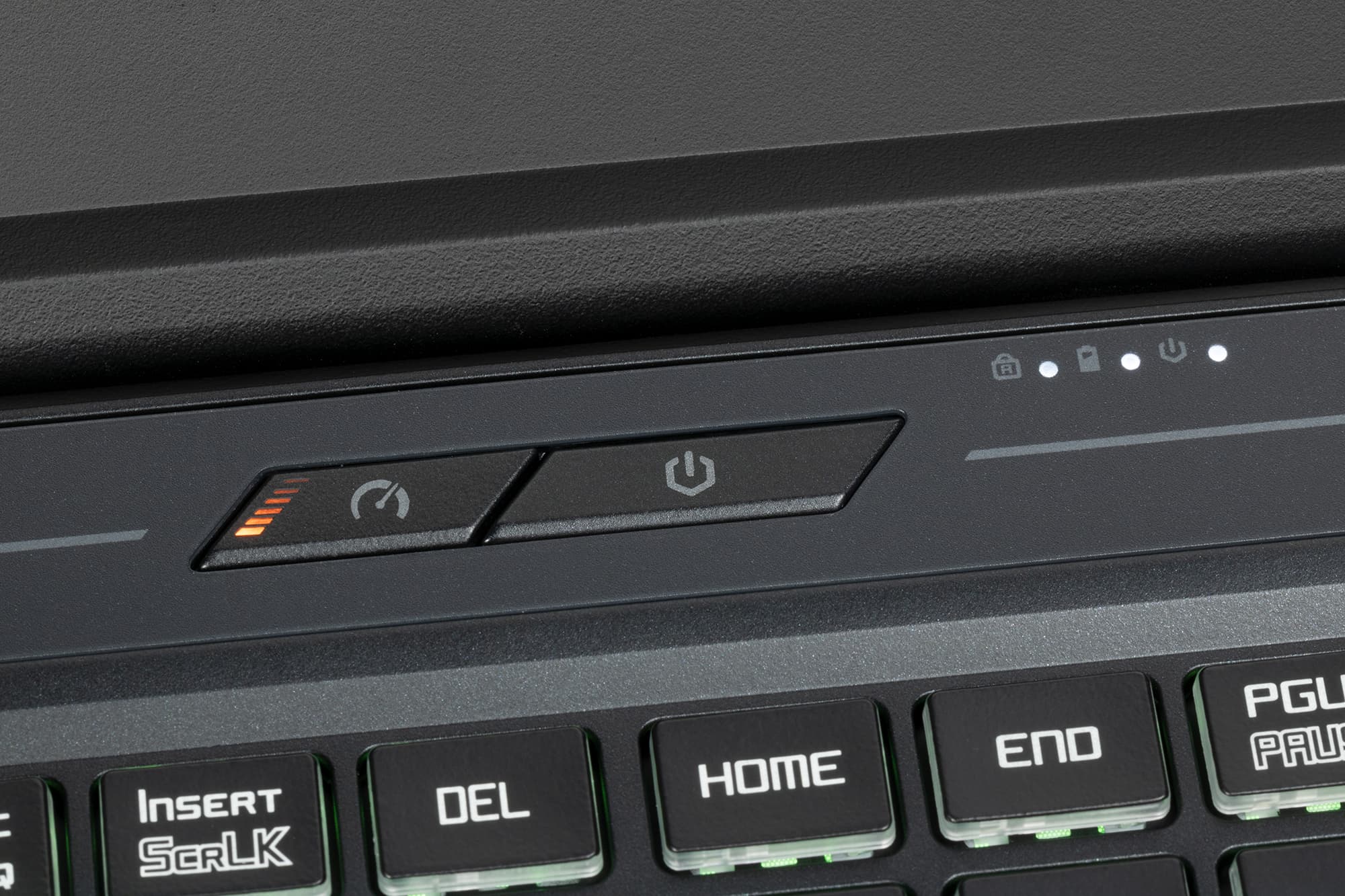 Кнопка включения питания располагается в отдельном ряду поверх всех остальных. Слева с ней соседствует кнопка циклического переключения сценариев работы, а правее и выше помещены три сигнальных светодиода: активации Caps Lock, происходящей зарядки аккумулятора и подключения к адаптеру питания.