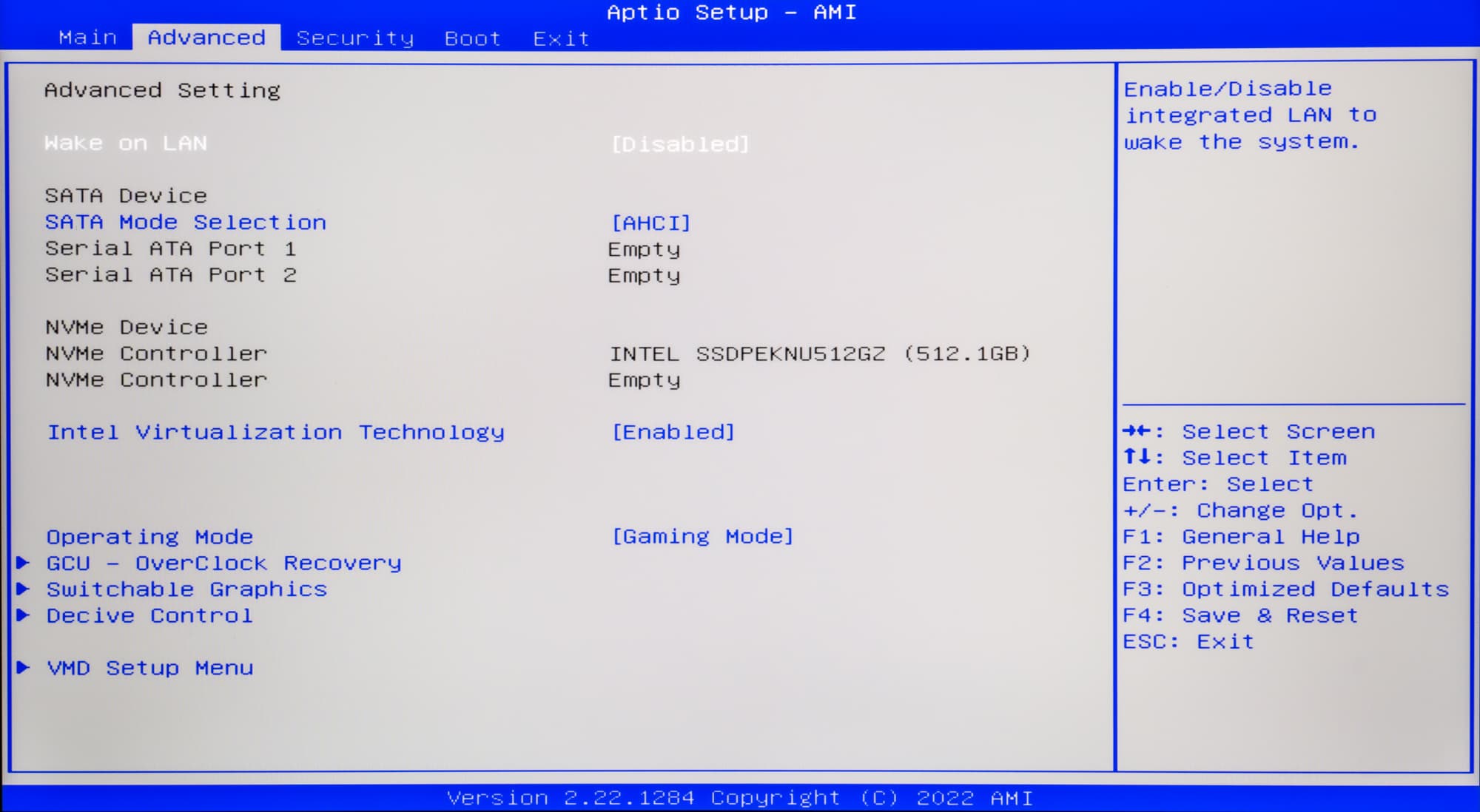 Вторым после Wake on LAN (пробуждение по локальной сети) фигурирует установка режима работы накопителей SATA. Здесь доступен только режим AHCI (Advanced Host Controller Interface), а встречавшаяся ранее эмуляция IDE (Integrated Device Electronics) не реализована. Ниже нашлось место для SSD-накопителей с интерфейсом NVMe (Non-Volatile Memory express). Правда, поменять здесь ничего нельзя, но можно видеть, какие модели установлены в первом и втором слотах.