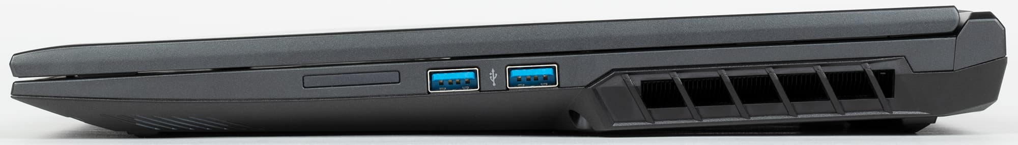 Справа расположены резиновая заглушка (вероятно, на месте слота отсутствующего картовода для носителей SD), два порта USB Type А и боковая решетка выходного тракта системы охлаждения.