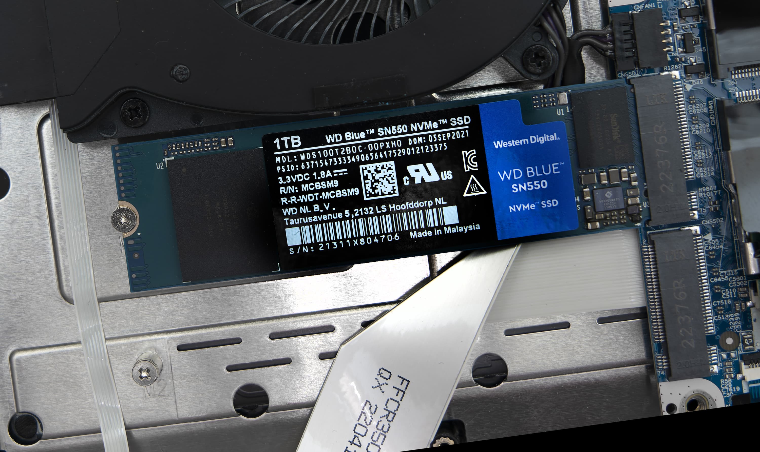 Как мы уже упомянули, для SSD-накопителей предусмотрено два слота M.2. Второй свободен, а в первом (в нашем случае) установлено NVMe-хранилище Western Digital Blue SN550 (WDS100T2B0C) вместимостью 1 ТБ.