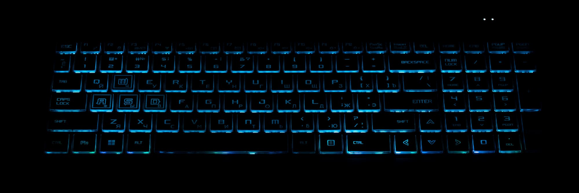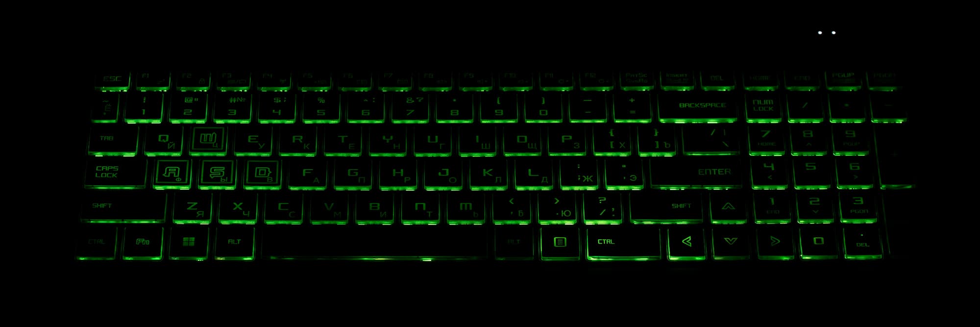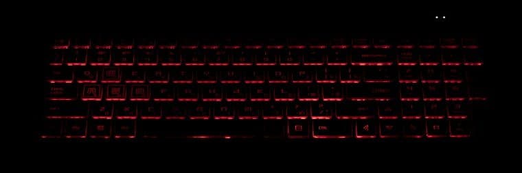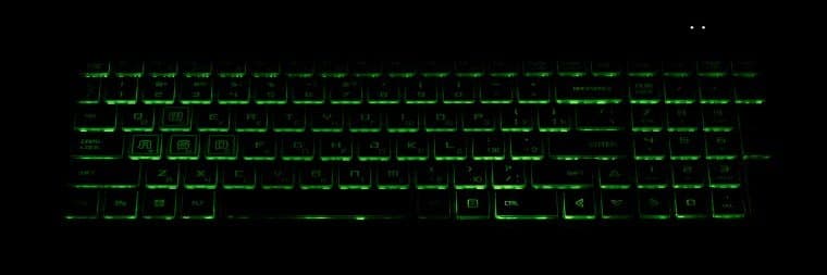 Клавиатура снабжена подсветкой с тремя уровнями по яркости (четвертое состояние — выключена). Переключение производится повторными нажатиями аккордов Fn и F7. Подсвечиваются сами символы на клавишах и их контуры. Зона подсветки под каждой клавишей хорошо видна при отклонении от клавиатуры. По интенсивности она явно превосходит яркость символов на клавишах. Распределение света не позволяет четко видеть символы русской раскладки. Есть возможность переключения цветов, но не для каждой клавиши, а для всех вместе. Подсветка с переливами поддерживается только для смены цвета всей клавиатуры.