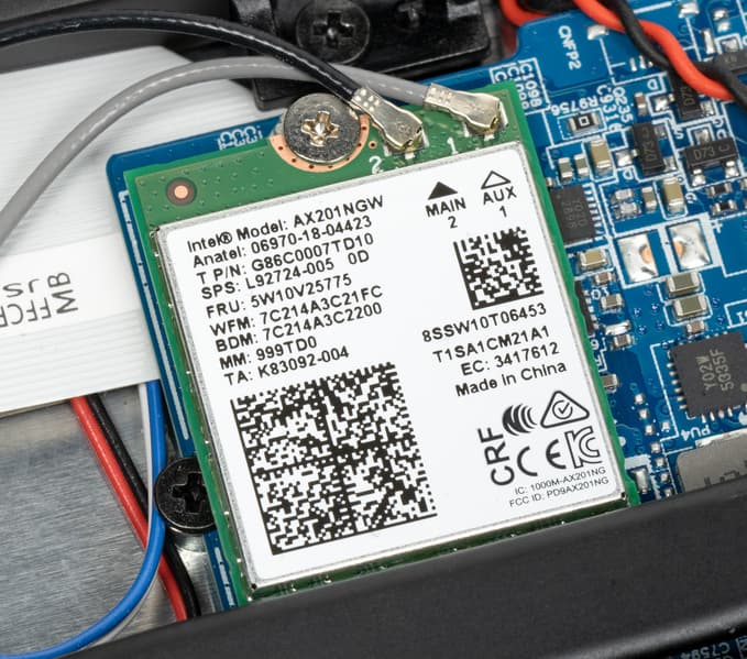 Под вентилятором GPU помещается двухдиапазонный (2,4/5 ГГц) адаптер беспроводной связи Intel AX201NGW (Harrison Peak). Будучи устройством класса Wi-Fi 6, он поддерживает стандарт IEEE 802.11ax с одновременным приемом и передачей данных двумя антеннами (2T2R MU-MIMO) и параллельный транспорт по радиоканалам с ортогональным частотным разделением при множественных подключениях (OFDMA). Он же реализует связь по Bluetooth. На сегодняшний день это не самое современное устройство радиосвязи для мобильных ПК (анонс состоялся в 2019 г.), но все еще весьма привлекательное.