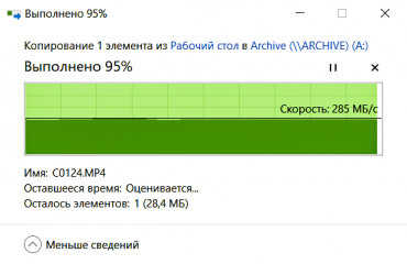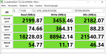 Скорости чтения/записи — 2400/1950 МБ/с. Неформатированная емкость составляет 1000 ГБ, в рабочей конфигурации со служебными разделами доступное пользователю пространство уменьшается до 870 ГБ, а после установки Windows 11 с драйверами и дополнительными приложениями оно сокращается еще на 40—50 ГБ.