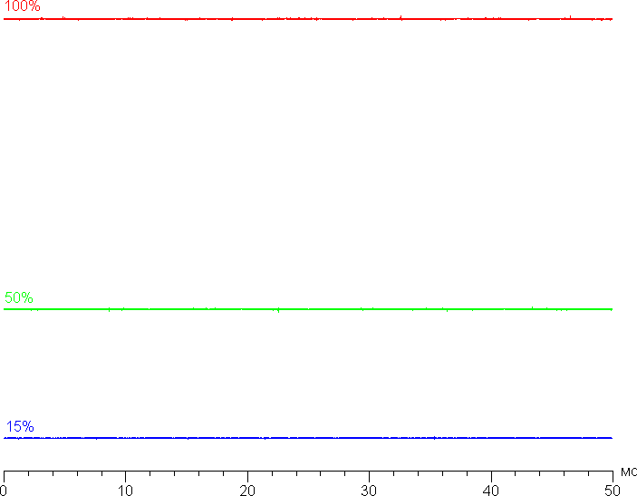 На любом уровне яркости значимая модуляция подсветки отсутствует, поэтому нет и никакого мерцания экрана. В доказательство приведем графики зависимости яркости (вертикальная ось) от времени (горизонтальная ось) при различных значениях настройки яркости: