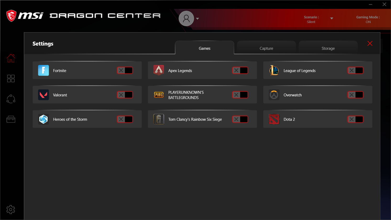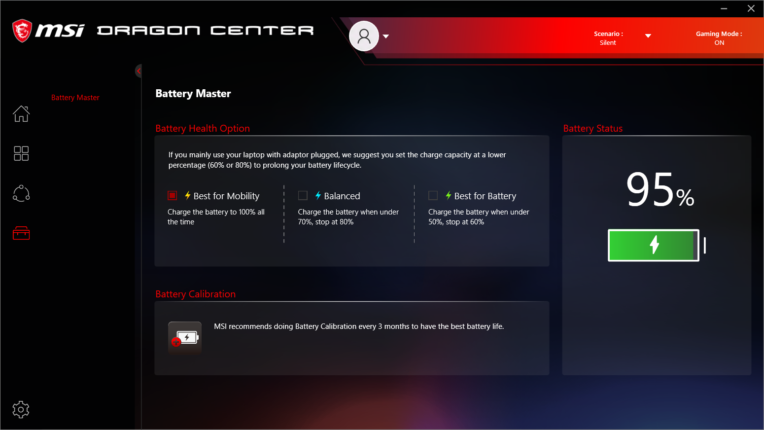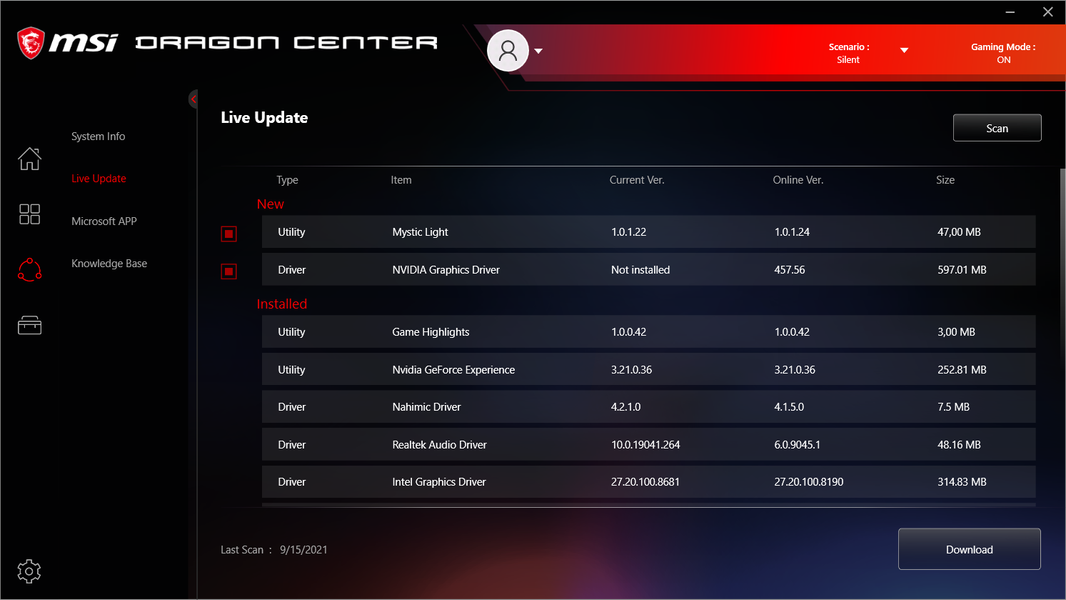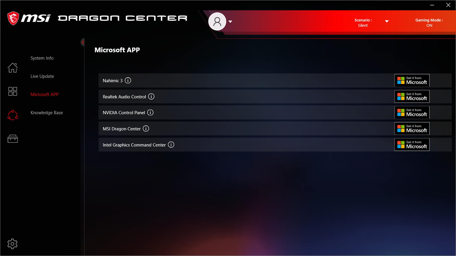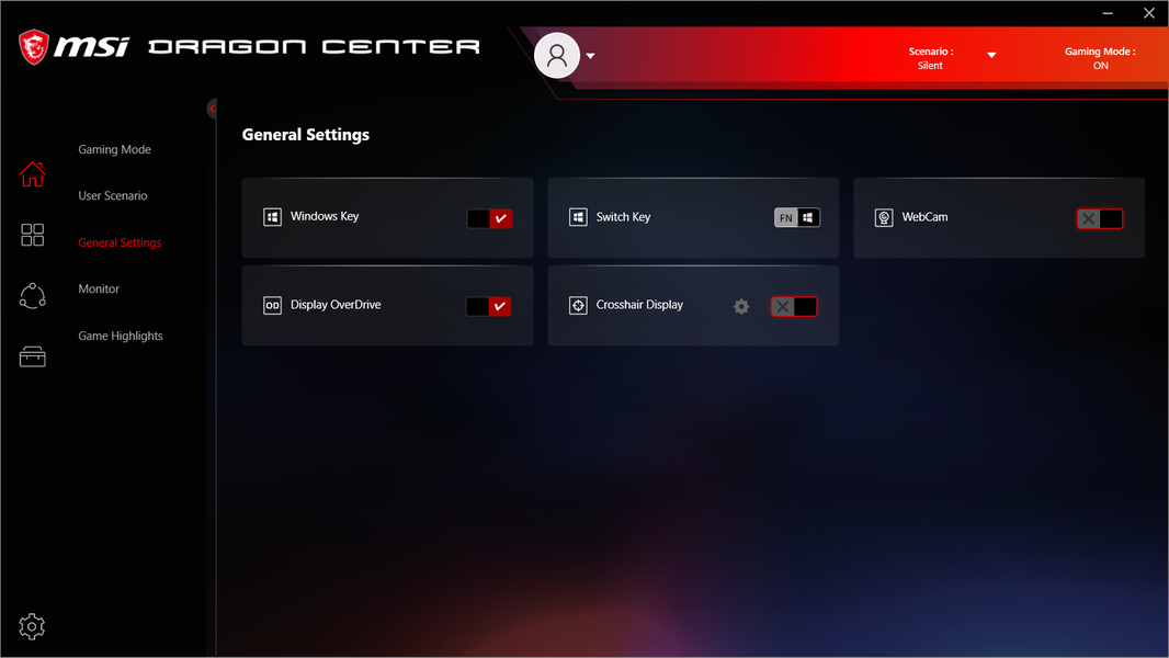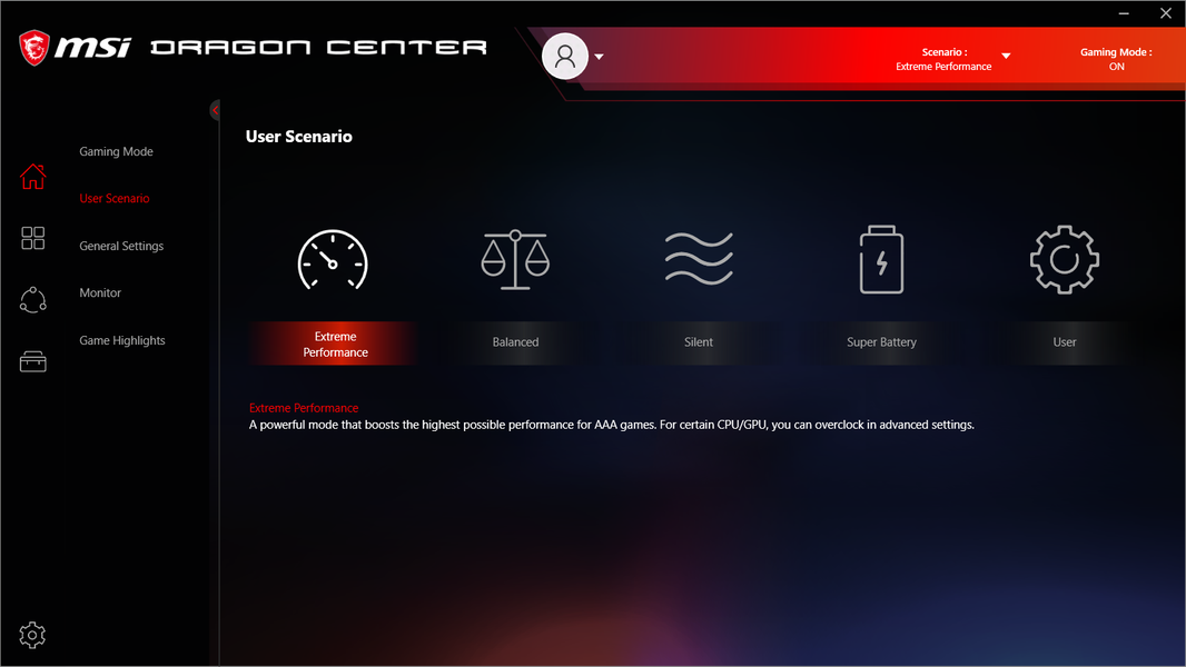 Ноутбук поставляется с Windows 10 Home, фирменными утилитами MSI Dragon Center, MSI Companion и Nahimic. Главной функцией фирменной утилиты Dragon Center является выбор сценария работы комплектующих и системы охлаждения. Всего предлагается 4 готовых пресета с очевидными названиями, а также пользовательский сценарий.