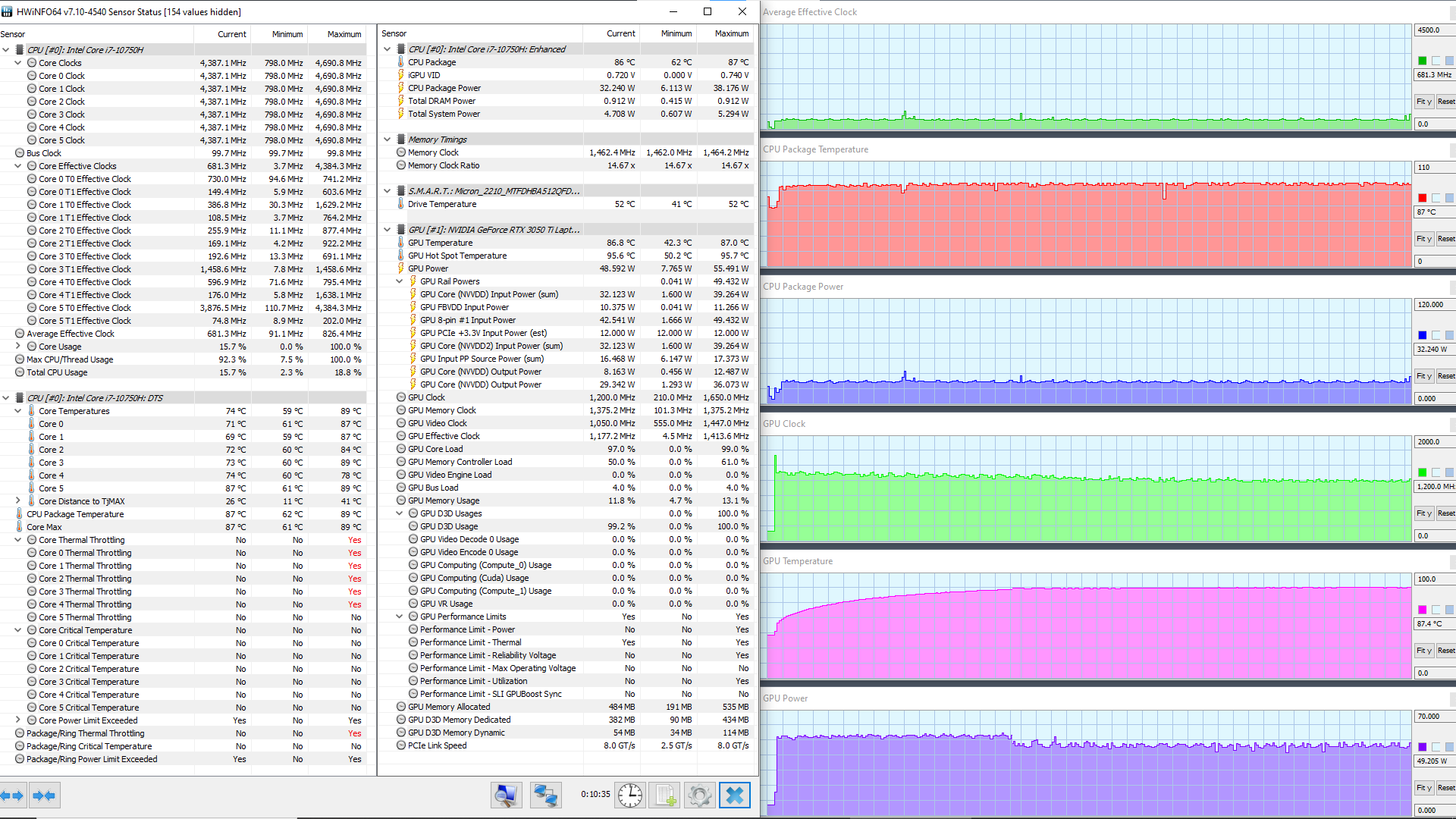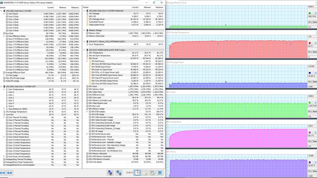 В ноутбуке используется 6-ядерный (12-поточный) процессор Intel Core i7-10750H с базовой частотой 2,6 ГГц и максимальной — 5,0 ГГц. Цифры внушительные, тем более что при тестировании под нагрузкой мы видели, как в профиле Extreme Performance процессор легко отбирает штатную мощность (TDP 45 Вт), а в пиках потребляет 71, 77 и даже 88 Вт. При этом он перегревается, а стабильность сохраняет как раз при штатных значениях. Посмотрим, какова будет производительность системы.