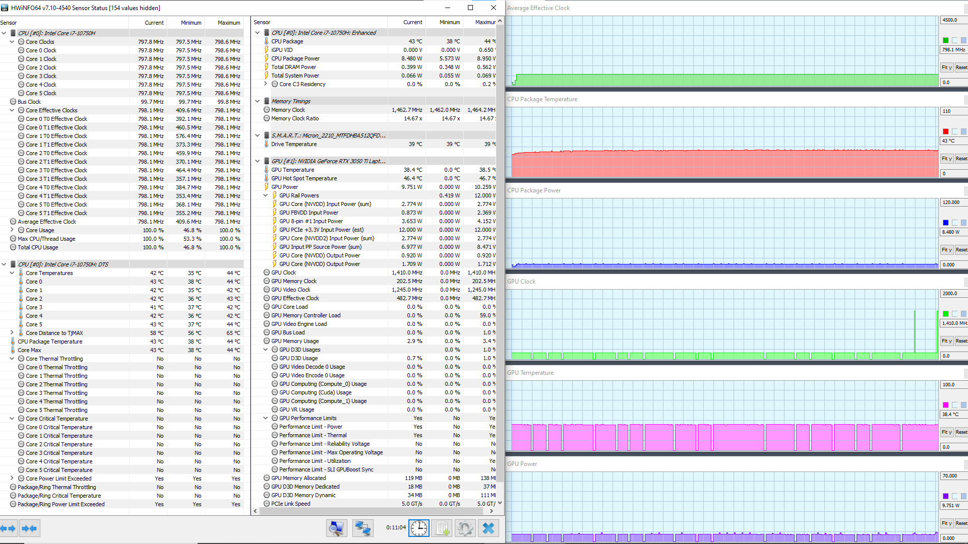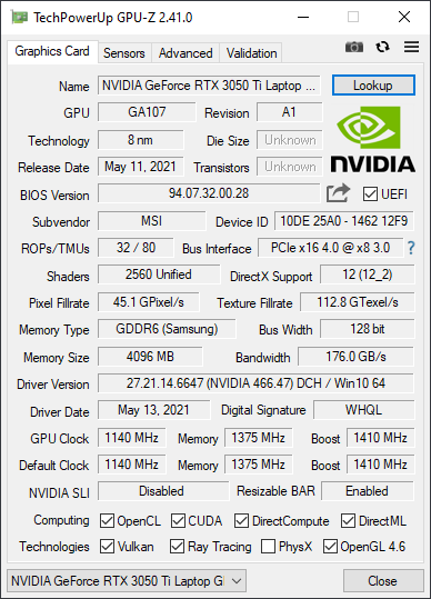 Интегрированная графика процессора Intel в играх не интересна, но в ноутбуке установлена дискретная игровая видеокарта Nvidia GeForce RTX 3050 Ti Laptop с 4 ГБ GDDR6. Как сказано выше, это бюджетное решение, поддерживающее, впрочем, трассировку лучей. Низкоуровневые параметры этого ускорителя представлены на скриншоте, мы же по итогам тестирования можем подтвердить, что он штатно работал при потреблении 52—59 Вт.