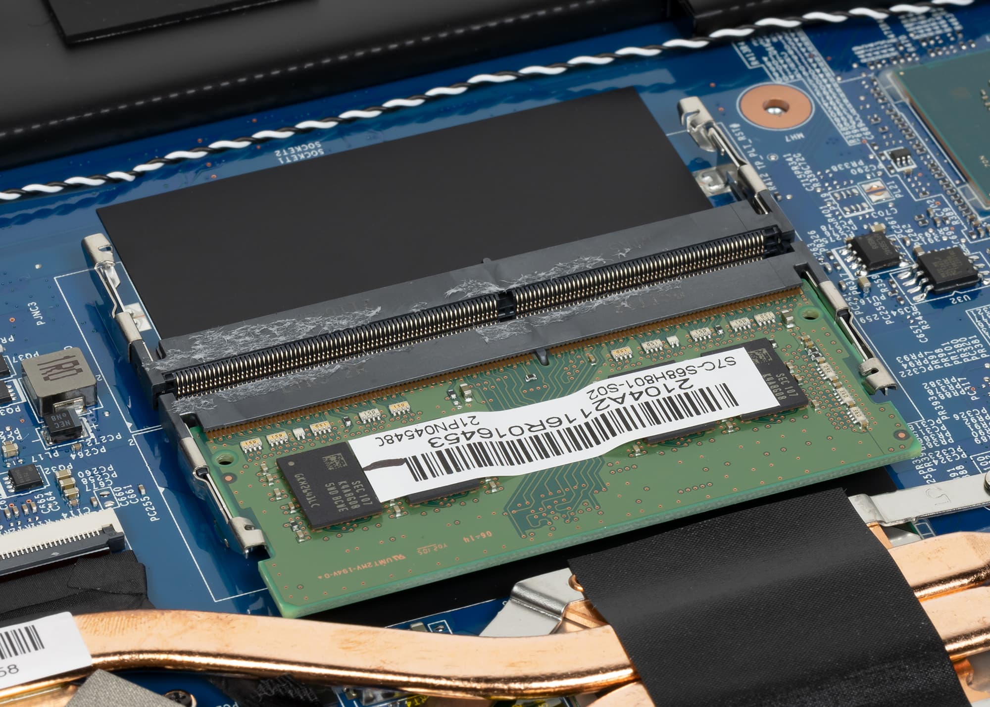 Модуль оперативной памяти всего один. Его объем составляет 8 ГБ, и этим значением ограничивается весь ресурс ОЗУ в ноутбуке. Второй разъем SO-DIMM не занят. Вставив в оба слота 32-гигабайтные планки, можно получить максимальный на сегодняшний день объем ОЗУ 64 ГБ.