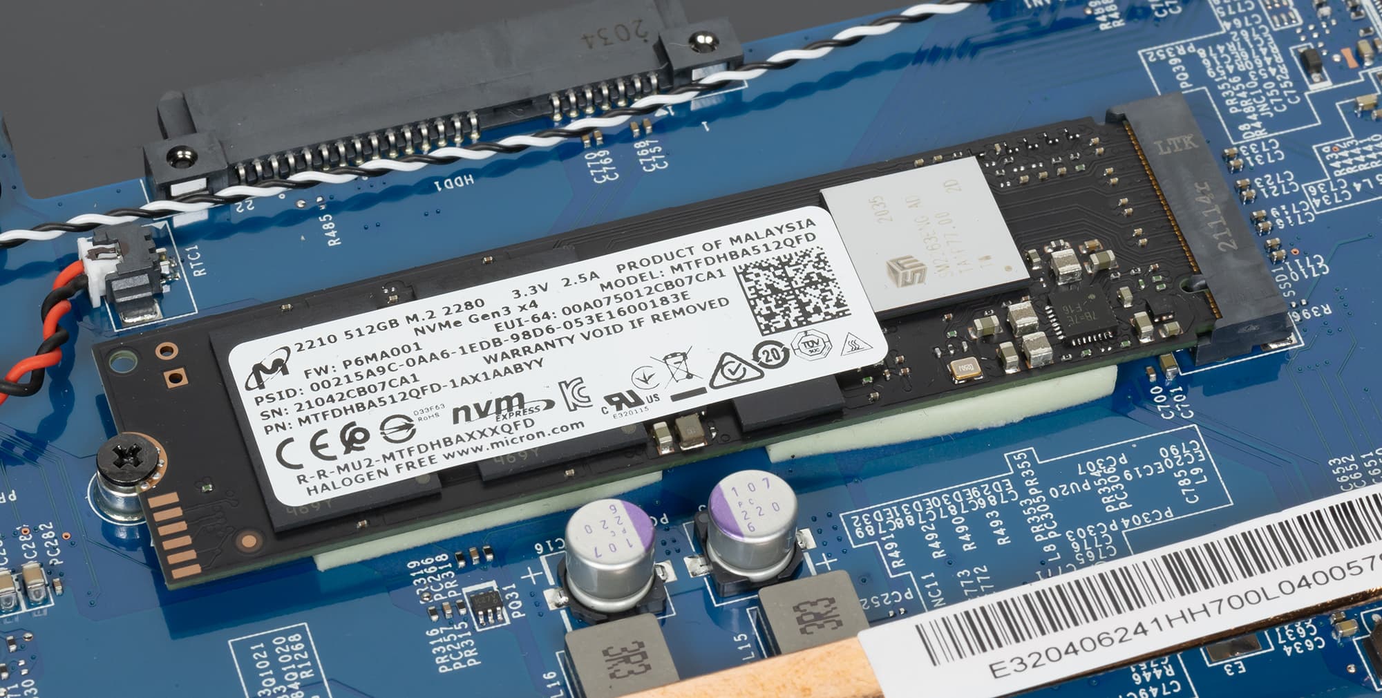 Системный твердотельный накопитель Micron 2210 MTFDHBA512QFD форм-фактора M.2 (с интерфейсом PCIe 3.0 x4) обладает неформатированной емкостью 512 ГБ.