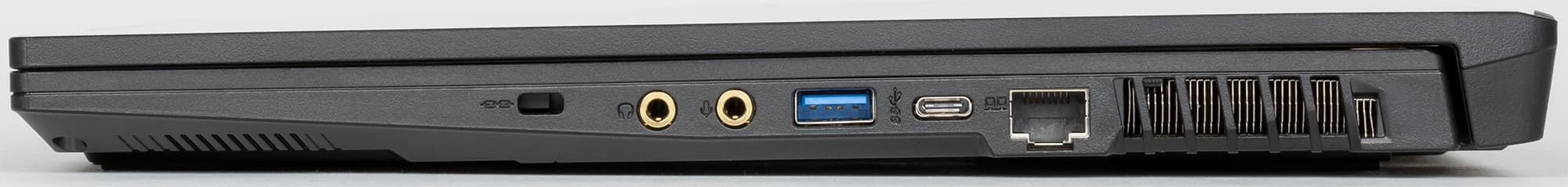 На правой боковой панели имеются отверстие кенсингтонского замка, два миниджека для подключения микрофона и наушников, один порт USB 3.2 Gen1 Type-A, один USB 3.2 Gen1 Type-C и коннектор RJ-45 гигабитной сети Ethernet.