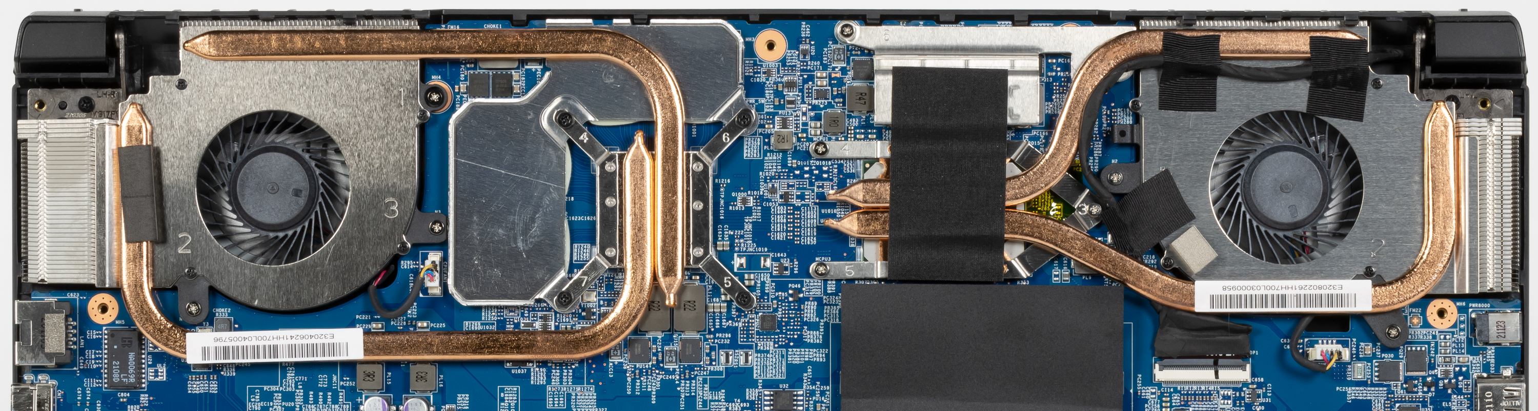 Новая система охлаждения машины состоит из двух модулей, по одному для CPU и для GPU, причем каждый из них использует две тепловые трубки, два радиатора и один вентилятор. Синхронная работа обоих кулеров исключается, создаваемый шум лучше дозируется, а в энергоэкономичных сценариях вентилятор видеокарты не запускается вообще. Кулер центрального процессора, напротив, не затихает ни на минуту. Но в высокопроизводительных профилях система охлаждения работает на пределе своих возможностей, из-за чего в CPU возникает перегрев и тротлинг 2—5 ядер, да и видеокарта разогревается сильнее обычного.